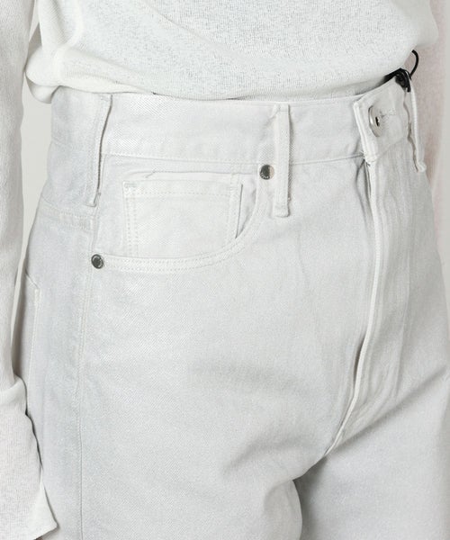 【素材】 備中備後産地で生産されたMADE IN JAPANの別注生地を使用。しっかりとした肉感があり、着心地も良好です。また、全面に施されたラメ箔が特徴的で、華やかさを加えています。ラメの輝きは着用を重ねるごとにはがれていきますが、それがまた独特の風合いとなり、経年変化を楽しむことができます。素材感がしっかりしているため、動きやすさと快適さを両立しつつ、見た目に上品な印象を与えます。