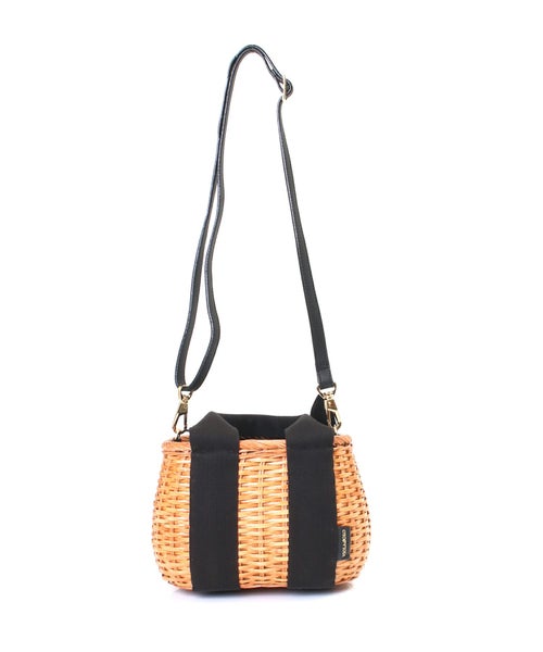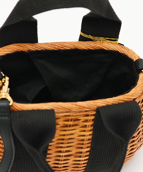 【デザイン】カラーテープとスカーフがアクセントになったラタンバッグ。ころんとしたフォルムがコーディネートに華を添えてくれます。取り外し可能なショルダーストラップ付きで、斜めがけも可能な2WAY仕様。コンパクトな見た目ながらもマチがしっかりあり、長財布など身の回りの物が収納できる普段使いに便利なサイズ。スカーフタイプのライニング付きで、荷物が見えないのも嬉しいポイント。