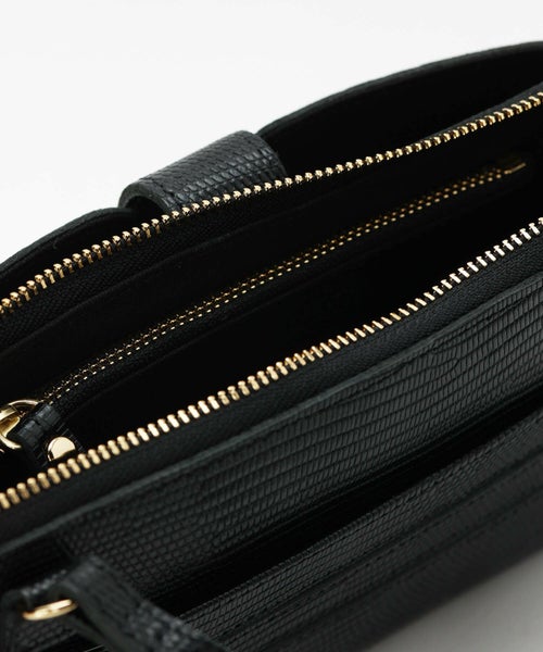 【デザイン】VIOLAd'ORO(ヴィオラドーロ)の横型のスマートフォンポシェット。リザードの型押しレザーが女性らしいデザイン。 正面にはスマートフォンが収納できるポケット、背面にはカードスリット2ヶ所とポケットが付いており必要なものがすぐに取り出せます。 ファスナー付きのメイン収納には二つ折り財布やエコバッグなど身の回りのものがコンパクトに収まりますので、これ一つでお出かけ可能です。