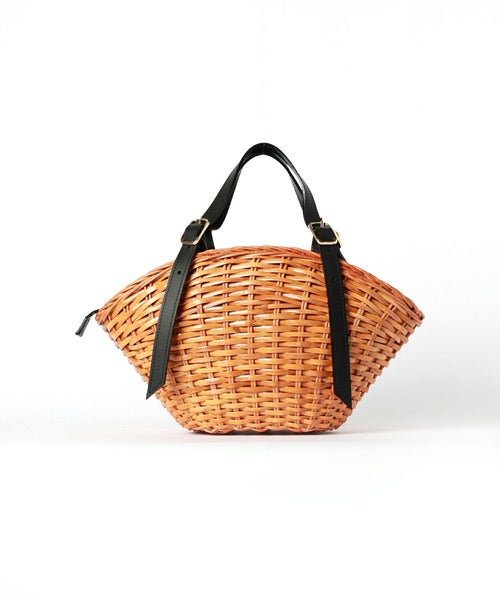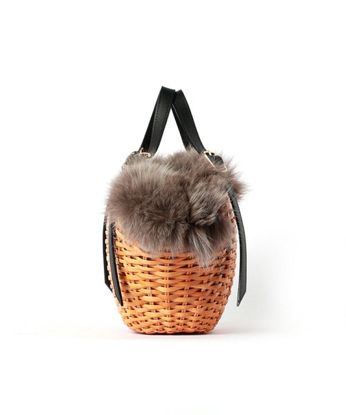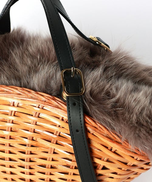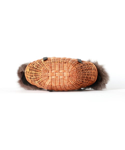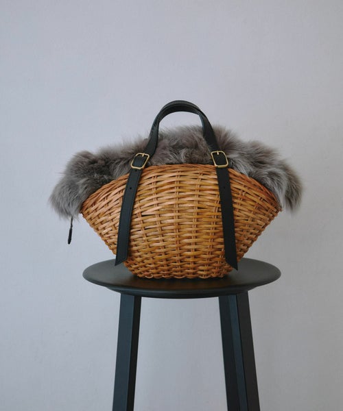【素材】本体は艶加工を施したスプリットラタンを使用し、しっかりとした硬さと艶やかな光沢が特徴。見た目にはナチュラルな風合いながら、触れると頑丈さと高級感を感じられます。ハンドルやパーツに使われている牛床革は耐久性に優れ、使うほどに味わいが増す素材。開口部のフォックスファーはふんわりと柔らかく、視覚的にもシーズンムードを高める華やかなアクセントになります。