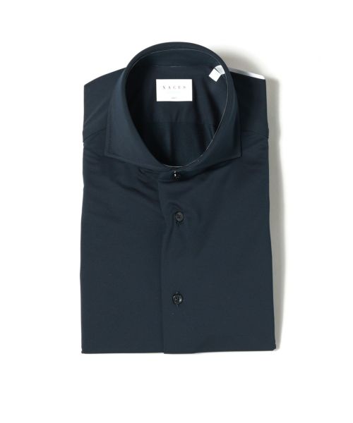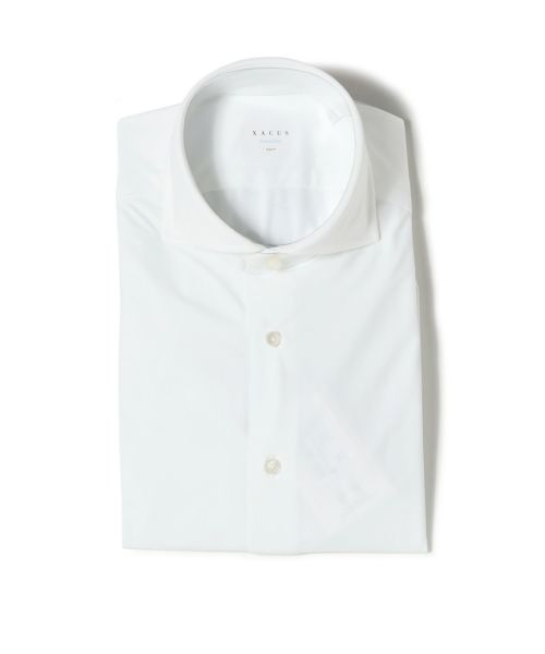 【デザイン】 XACUS(ザッカス)のドレスシャツ。端正な顔付きのドレスシャツですが、生地に最大の特徴があり、非常に伸縮性の高い縦横に伸びる素材で作られているので、クールビズにも取り入れやすい現代的な仕様になっております。シルエットはスリムフィットでビジネスをはじめとしたあらゆるシーンで着まわせるアイテムです。