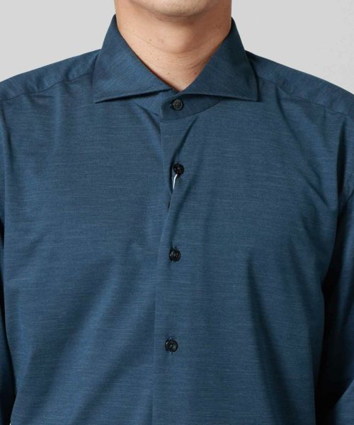 【デザイン】 XACUS(ザッカス)のドレスシャツ。端正な顔付きのドレスシャツですが、生地に最大の特徴があり、非常に伸縮性の高い縦横に伸びる素材で作られているので、クールビズにも取り入れやすい現代的な仕様になっております。シルエットはスリムフィットでビジネスをはじめとしたあらゆるシーンで着まわせるアイテムです。