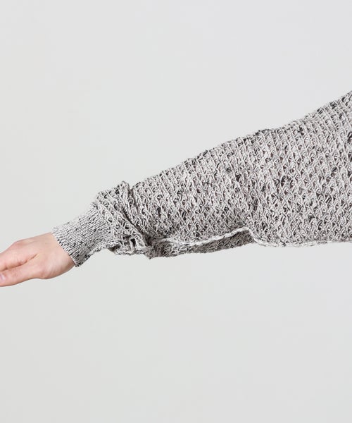 【デザイン】 YOKE(ヨーク)のメッシュニット。定番のギマコットンとスラブ糸を撚り合わせ製作されています。今までは2種類の糸で2色を撚り合わせていましたが、今シーズンはより色の混ざりを複雑にするため、2色混ざった糸を使用しているため3色になっているのが特徴です。そのため、デザイン自体はシンプルでありながら奥行きのある表情に仕上がり、存在感を放ちます。 ボディはメッシュ編みで、袖や裾などの各パーツは全て天竺編みで縁取りをしているため、着て動くと涼しい不思議なニット。一枚でもインナーでも活躍し、幅広いシーズンでご愛用いただける一着となっております。
