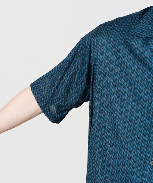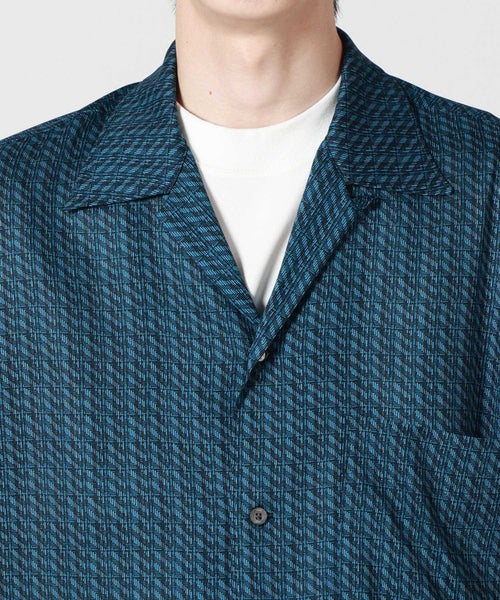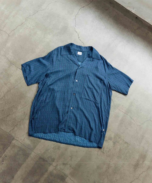 【デザイン】YOKE(ヨーク)のシャツ。オリジナルヴィンテージ柄をプリントした生地を使用したハーフスリーブオープンカラーシャツ。大きめの胸ポケット、袖丈も肘に近いあたりまでの少し長めの袖丈で、全体的にゆったりとしたシルエットです。特徴的な衿先9.5cmあるロングポイントの衿で、古着の雰囲気を踏襲しながらサイドにはボタンで開閉できるスリット仕様です。ブランドらしい芸術性を感じられるデザインに仕上がっています。