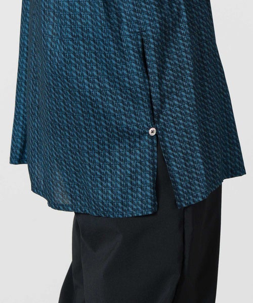 【素材】レーヨン100%を使用。柔らかさと落ち感が特徴の細番手のレーヨン生地に、発色の良さや色の再現性、生地裏までの浸透性の高さに特徴がある手捺染でプリントしています。ボタンには刻印入り貝ボタンを使用しています。ご自宅で洗濯機洗いができる扱いやすさも魅力です。