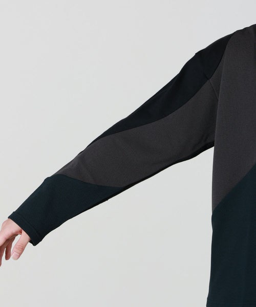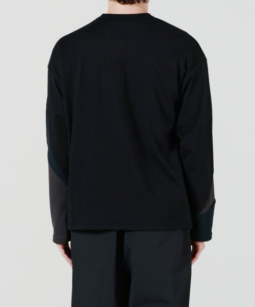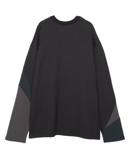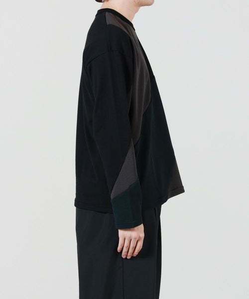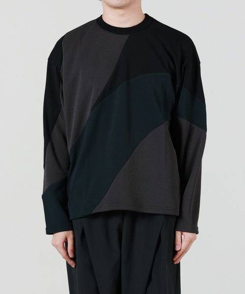 【デザイン】 yoshiokubo(ヨシオクボ)の長袖カットソー。斜めにランダムに切り替えられたデザインが印象的な一枚。デザイン性は高いながらも、落ち着いた配色となっており、デイリーに着易い一枚に仕上がっています。ややゆとりのあるボクシーなシルエット。