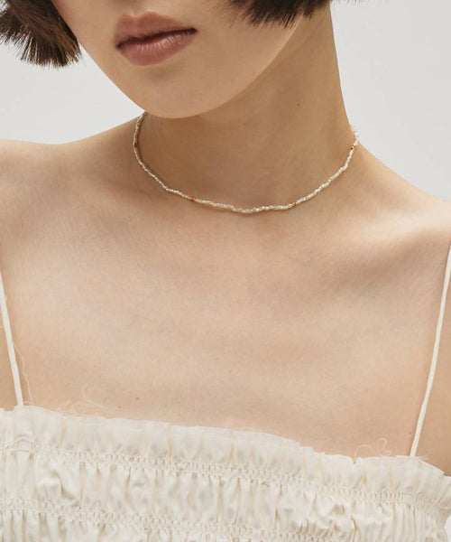 【デザイン】 TODAYFUL(トゥデイフル)のチョーカー。華奢なガラスビーズを丁寧に連ね、あいだに配したゴールドビーズが上品なアクセントを添えるミニマルなデザインが魅力のアイテムです。繊細にきらめくビーズが首元にさりげないニュアンスをプラスし、カジュアルからきれいめまで幅広いスタイリングに自然と馴染みます。単体ではもちろん、重ね付けでも活躍し、コーディネートの幅を広げてくれる一本。金具にはSilver925に16Kメッキを施し、上質感とつけ心地にもこだわりました。