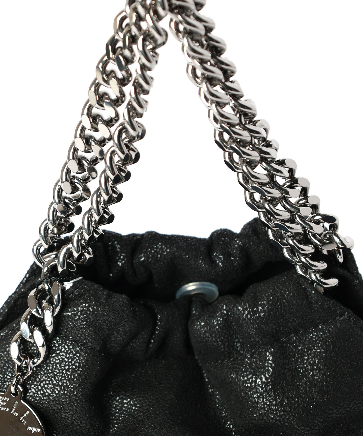 【デザイン】STELLA McCARTNEY(ステラ マッカートニー)のバッグ。 ブランドのシグネチャーである「ファラベラ」シリーズに、新たな魅力を添えたドローストリングトートです。立体感のあるフォルムに、ダイヤモンドカットのチェーンストラップが映えるデザイン。マットな質感が洗練された印象を与えつつ、スマホや財布、日用品がしっかり収納できるサイズ感で、デイリーにもオケージョンにも活躍します。肩掛けも可能なチェーンストラップと、手持ちにも便利なトップハンドル付きで、シーンに応じた持ち方が楽しめます。