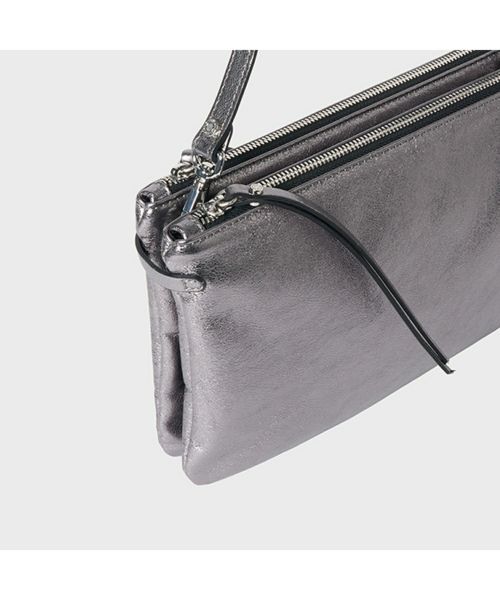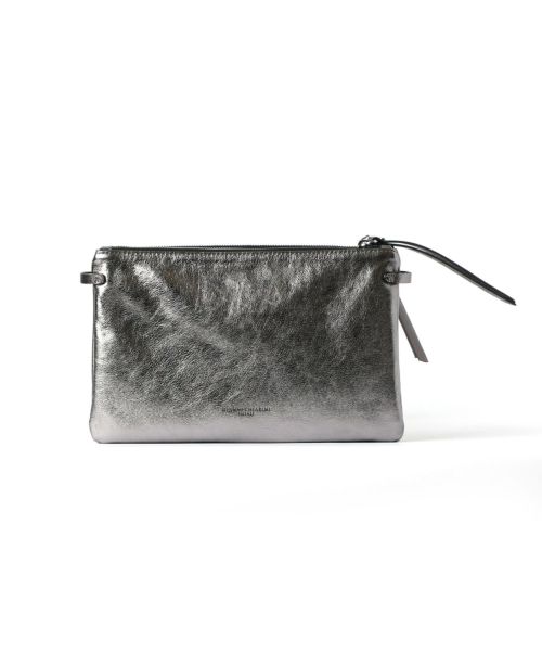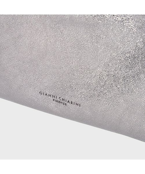 【デザイン】GIANNI CHIARINI(ジャンニ・キアリーニ)のバッグ。シルバーでシャープな印象のレザーを使用したHERMY(ハーミー)。携帯やミニウォレット、口紅などの必需品がしっかり収まります。薄型のコンパクトなサイズ感が上品な印象で休日の身軽なお出かけにはもちろん、パーティーシーンにも大活躍。長さ調節可能なショルダーストラップ付きで、肩がけや斜めがけでお持ちいただけます。 内ポケット:なし
