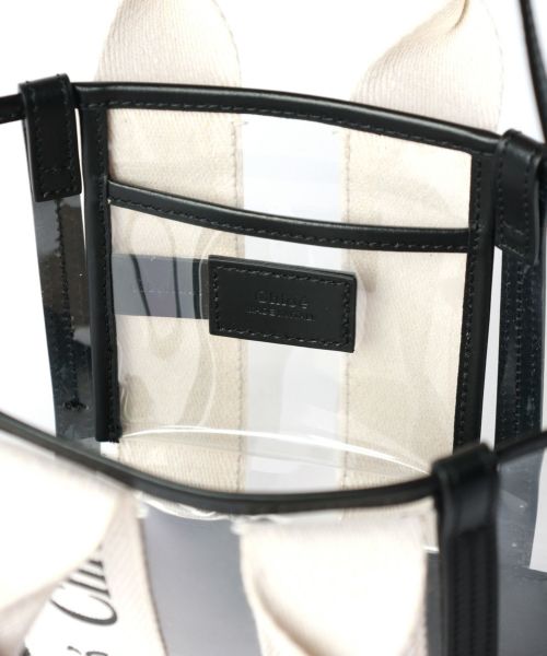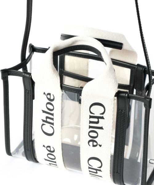 【デザイン】Chloe(クロエ)のバッグ。人気の「Woody」シリーズから登場した、PVCとレザーの異素材ミックスが目を引くトートバッグです。モダンで透明感のあるPVC素材に、レザートリムを施したバランスが絶妙。ブランドロゴをあしらったジャカードのトップハンドルが印象的で、カジュアルにもエレガントにも対応します。手持ち・肩掛け・斜め掛けとシーンに合わせて使い分けが可能。内側にはスリップポケット付きで、実用性も抜群です。