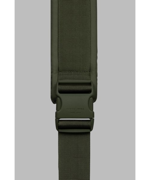 着脱可能でクッション性のあるショルダーベルト、キーチャーム、"PORTER × HYKE" オリジナル収納袋付き。