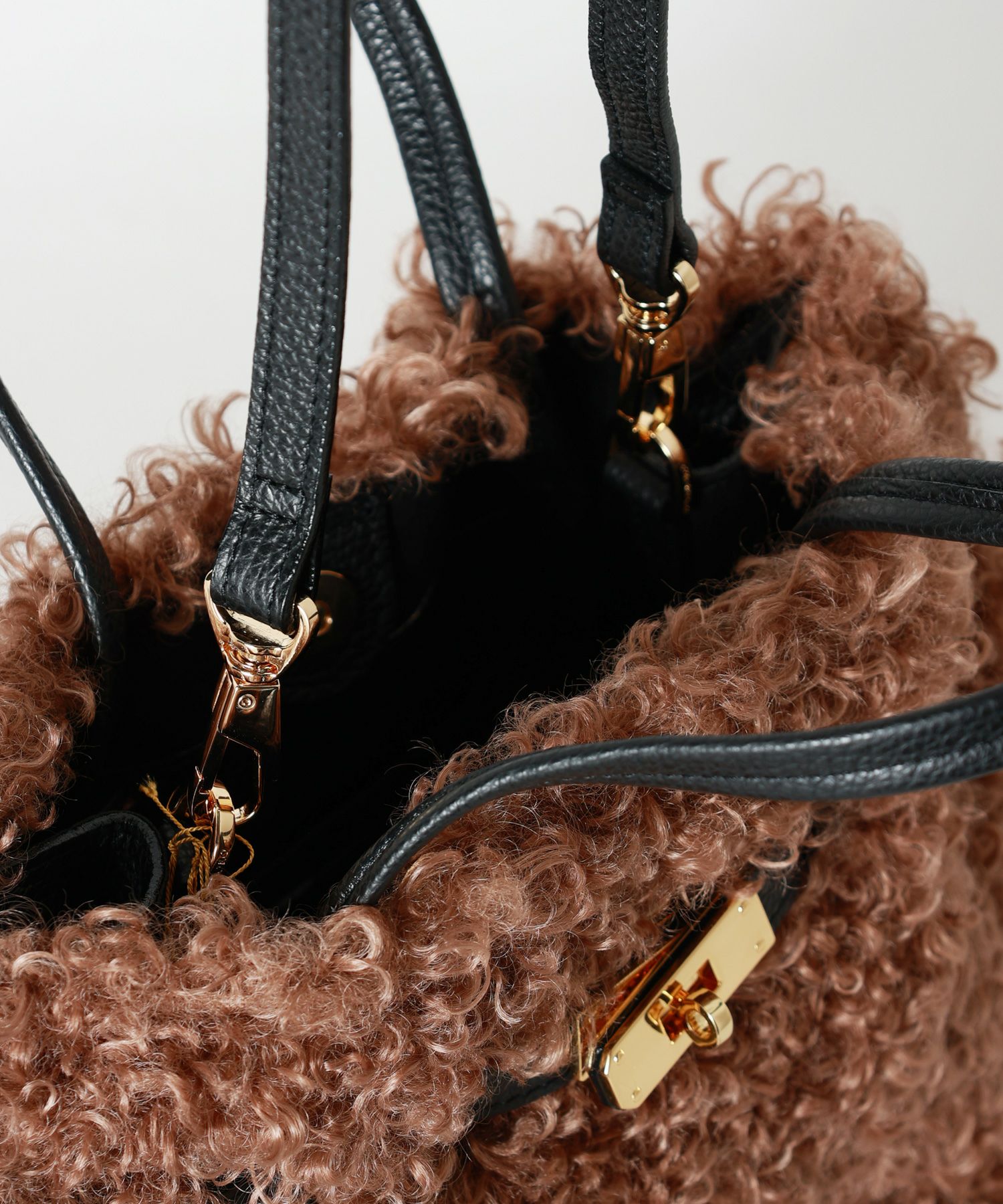 【デザイン】 VIOLAd'ORO(ヴィオラドーロ)のバッグ。かちっとしたフォルムとフロントの金具使いがポイントになったアイテム。くるくるしたカールが魅力のカルガンラムタイプのエコファーを使用。特別感とカジュアル感を併せ持っているので、コーディネートに幅広く使用いただけます。ハンドルはレザーを使用し、高級感をプラス。大人の女性が持てるバッグに仕上げられています。コーディネートに取り入れるだけで一気に秋冬らしいスタイリングに仕上げてくれます。取り外し可能なショルダーストラップ付きです。
