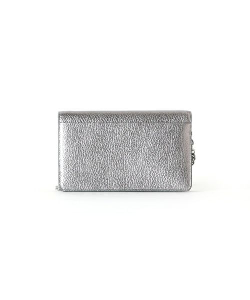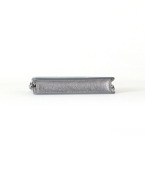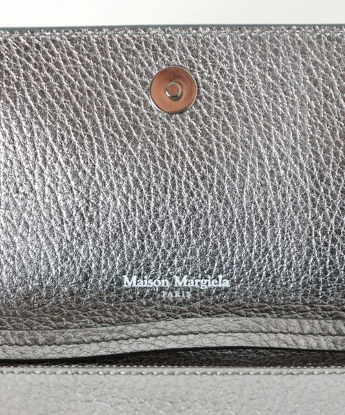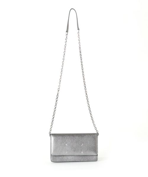 【デザイン】Maison Margiela(メゾンマルジェラ)のお財布バッグ。 メタリックなグレインレザーを使用したミディアムサイズのウォレットバッグです。。フロントにはメゾン マルジェラのシグネチャーである4ステッチが施され、ブランドのアイコニックなデザインが光ります。取り外し可能なチェーン&レザーのストラップが付属し、クロスボディとしても使用可能。マグネットボタンの開閉式で、内側にはジッパーセクションとカードスロットを完備。背面にはフラットポケットもあり、機能性も抜群です。ナンバリングロゴが内側にあしらわれ、メゾンらしい洗練されたディテールが特徴のバッグです。