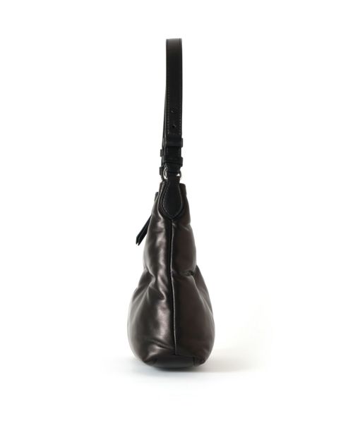 【素材】 フルグレインナッパレザーは、触れるたびに滑らかなシルキーな質感が手に馴染み、洗練された印象を与えます。光沢のある表面と、ヒートシーリングによるキルト加工が美しい立体感を生み出し、見る角度によって異なる表情を楽しめます。ナイロンライニングは軽量で丈夫、内側にはジップポケットやロゴスタンプが施されており、使い勝手にも優れています。レザーショルダーストラップとメタルハードウェアが、全体のデザインにアクセントを加え、洗練された雰囲気を完成させます。