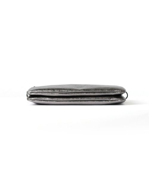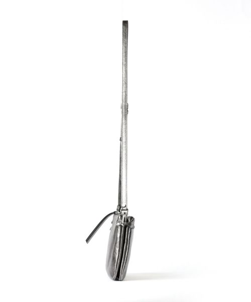 【デザイン】GIANNI CHIARINI(ジャンニ・キアリーニ)のバッグ。シルバーでシャープな印象のレザーを使用したHERMY(ハーミー)。携帯やミニウォレット、口紅などの必需品がしっかり収まります。薄型のコンパクトなサイズ感が上品な印象で休日の身軽なお出かけにはもちろん、パーティーシーンにも大活躍。長さ調節可能なショルダーストラップ付きで、肩がけや斜めがけでお持ちいただけます。 内ポケット:なし