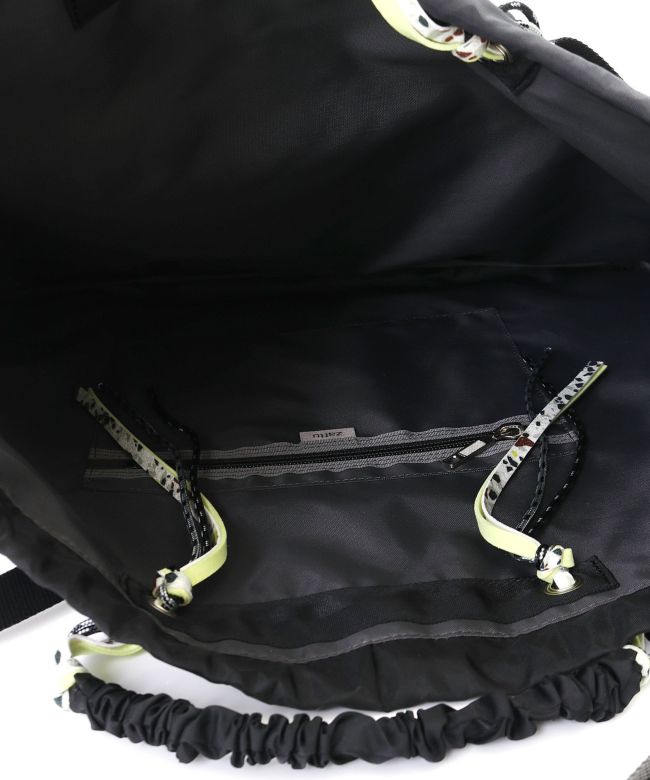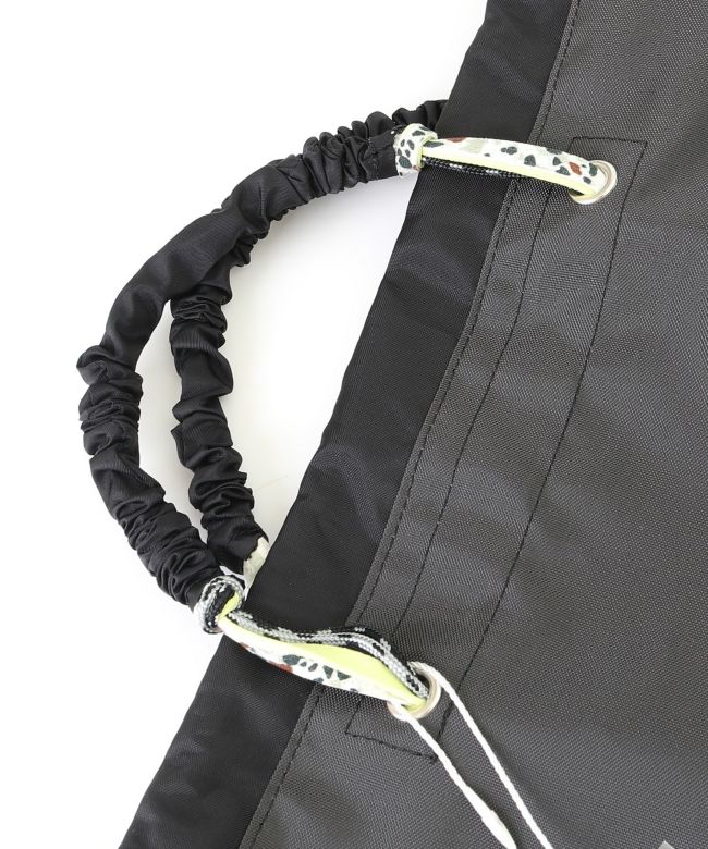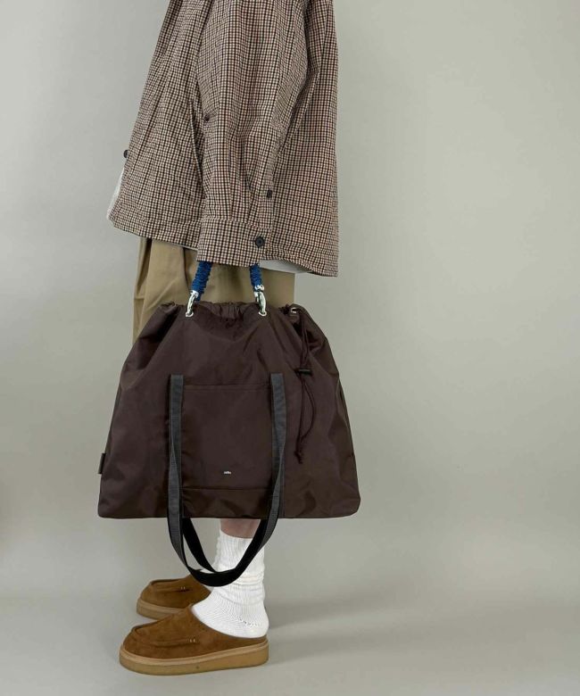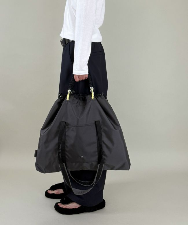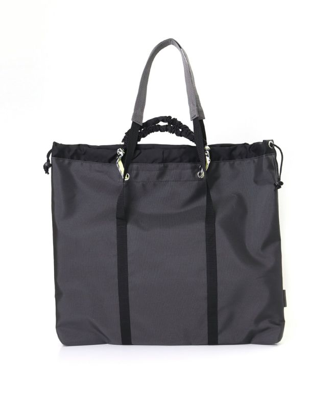 本体にはポリエステル糸のコーデュラ素材を使用。手持ちの際はハンドキャリーハンドルで、肩から掛けたいシチュエーションではワンショルダーハンドルとしてレギュラーハンドルを使用することが可能。素材違いなところもデザインとして秀逸。 開口部はカラーコードで調整することができるので、スクエアなトートとしてだけでなく巾着型バッグとしても使用可能。用途やコーディネートに応じた変化も楽しめます。