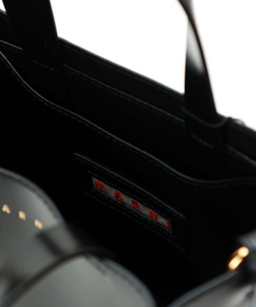 【デザイン】MARNI(マルニ)のバッグ。カーフレザーミニサイズのNorth-Southトートバッグです。内側にスロットポケット、ファブリック製ドローストリングが施されています。トップハンドルはレザー、取り外し可能なショルダーストラップはバックルで調節可能です。ゴールドトーンのメタルパーツ。外側にゴールドのプリントロゴでシックな印象に。