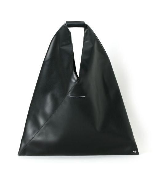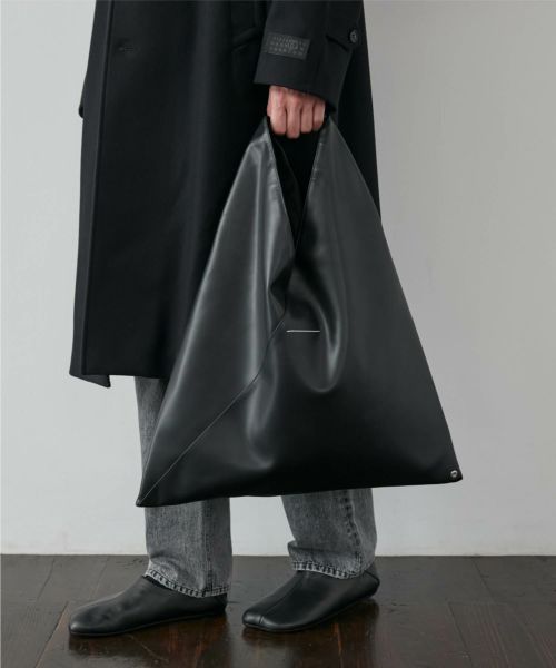 【デザイン】 シンセティックレザーのジャパニーズバッグ ミディアムです。2009年の秋冬コレクションのアイテムとして発表されたジャパニーズバッグは、発表以来、MM6 Maison Margiela(エムエムシックス メゾン マルジェラ)を代表する象徴的なアクセサリーとなっています。日本の伝統的な折り紙にインスパイアされた三角形のフォルムが特徴です。バッグの形を変えることができるスナップボタンも折り紙にインスパイアされた要素で、メゾンの脱構築的なデザインコードを反映しています。タイムレスなアクセサリーであり続けるため、ジャパニーズバッグは毎シーズン、サイズや素材を変えアップデートされています。