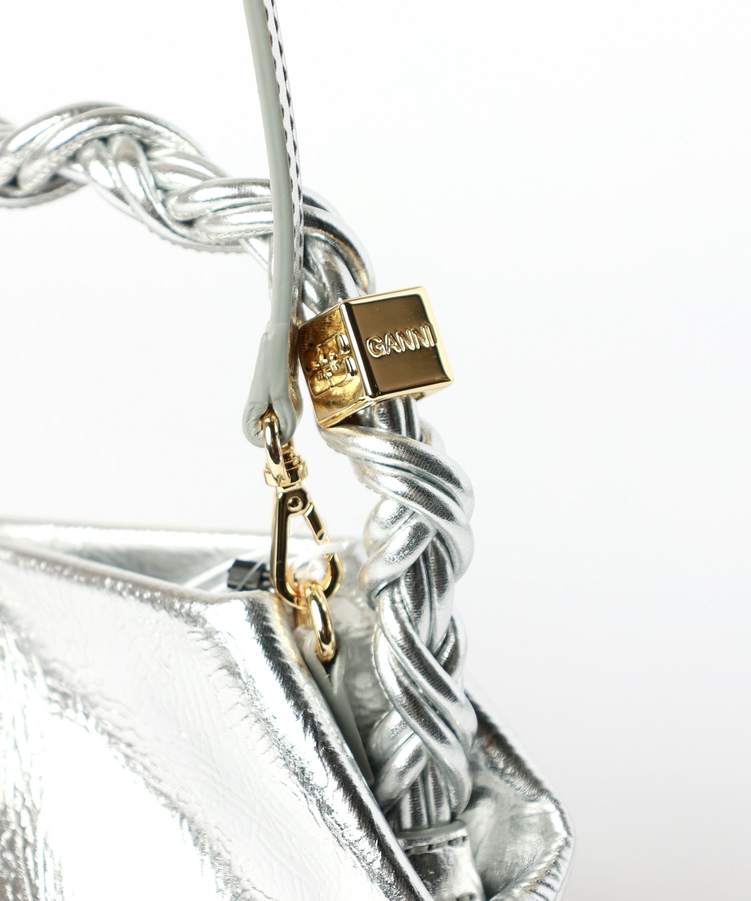 【デザイン】GANNI(ガニー)のバッグ。シルバーカラーに同系色のGANNIバタフライロゴを施した、モダンでエレガントなデザインが特徴のミニサイズバッグです。ツイストされた持ち手には編み込みノットが施され、遊び心と高級感を演出。ゴールドトーンのメタリックダイスにはGANNIとバタフライロゴが刻印され、細部までこだわり抜かれています。内部はマグネット式の開閉で使い勝手が良く、フラットカードポケットも備わり実用性も抜群。取り外し可能なショルダーストラップで、ハンドバッグにもクロスボディバッグにもアレンジ可能です。