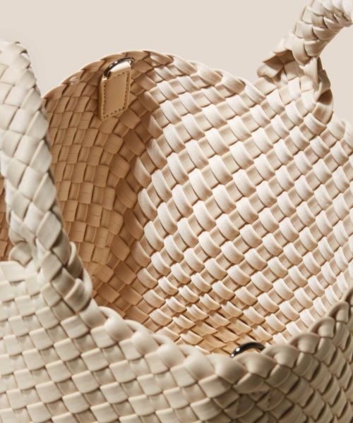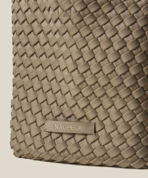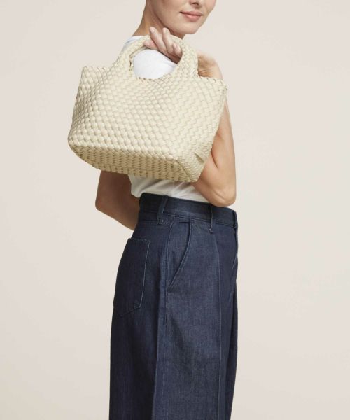 【デザイン】 NAGHEDI(ナゲディ)のバッグ。ブランドを象徴するネオプレン素材を丁寧に編み上げたスモールトート。軽量で扱いやすく、毎日の必需品がしっかり収まるサイズ感と程よく力の抜けたフォルムが魅力。長さ調整と取り外しが可能なクロスボディストラップ付きで、ハンド・ショルダー・クロスボディとシーンに合わせた持ち方が楽しめます。オンにもオフにも自然になじむ、毎朝手に取りたくなる万能トートです。同素材のジップ付きポーチつき。