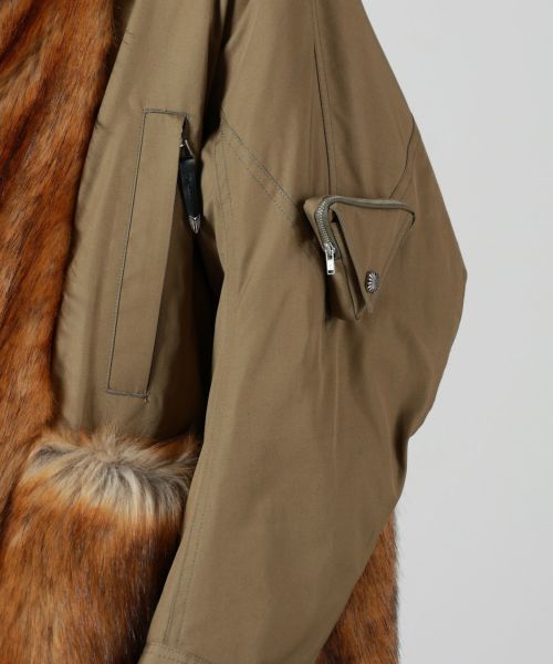 【デザイン】 TOGA VIRILIS(トーガ ビリリース)のコート。ミリタリージャケットのディテールをベースに、モードと実用性を融合。オーバーサイズのシルエットに、フロントのファスナーとボタンのダブルクロージャー、立体的なポケット配置が特徴的。襟元には取り外し可能なファーが施され、シーズンやスタイリングに応じて印象を変えることができます。バックにはドローコードが施され、シルエットの調整が可能で、機能性とデザイン性を兼ね備えてた一着です。