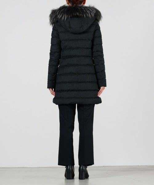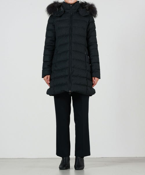 【デザイン】 タトラス定番のウール素材のミドル丈ダウンコートLAVIANA。ダウンステッチの幅を少し狭くすることで、タイトですっきりとした印象に。ミドル丈が細身のパンツやデニムはもちろん、ワンピースにも合わせやすいAラインデザイン。ファー、フードは取り外し可能。