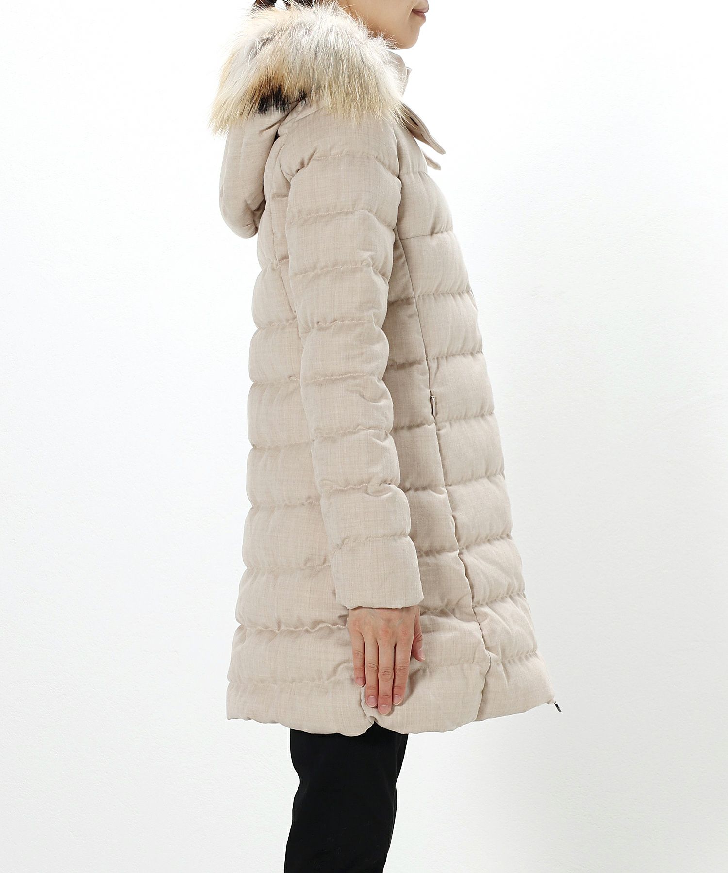 素材 (表地)毛100% (中綿)ダウン90%、フェザー10% (裏地)ナイロン100% (ファー)ポーランドラクーン(タヌキ)