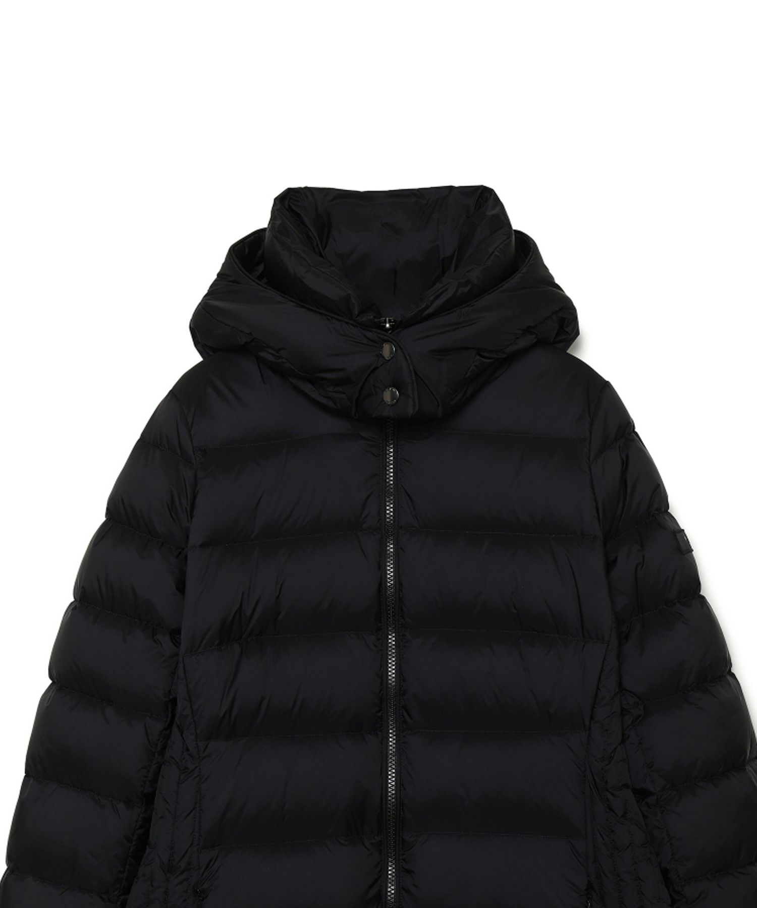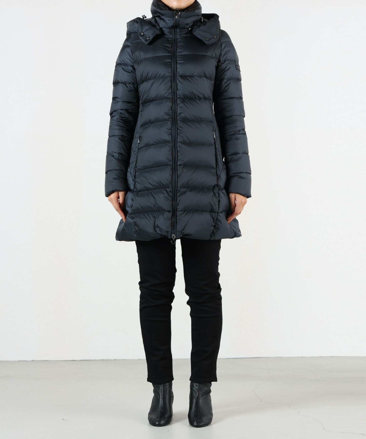 【デザイン】 TATRAS(タトラス)のミドル丈のダウンコート。シンプルなデザインを活かしてシルエットに徹底的にこだわったアイテム。ややAラインのシルエットは、裾にかけて丸みの出るような立体構造になっており、脇の後ろ部分の切り替えは、ボディをスッキリと包み込むような独自のシルエットに仕上がっています。前を開けて着こなせば、ボリュームのある衿がエレガントな雰囲気を醸します。裾にコードがあしらわれているので、スタイリングに合わせてシルエットや裾の調整が可能。フードは取り外し可能で、フードを取り外した際にファスナー部分が見えない仕様になっています。ポケットはコンシールファスナー付き。
