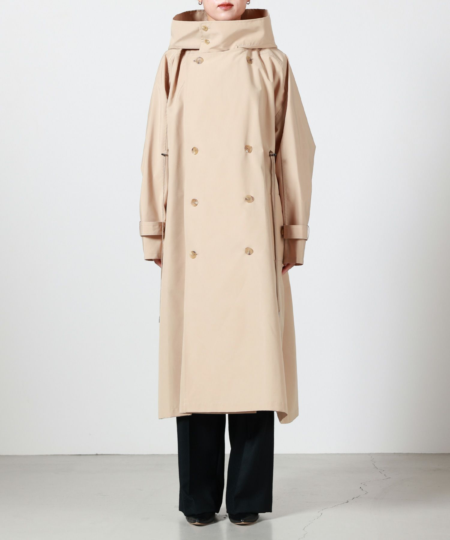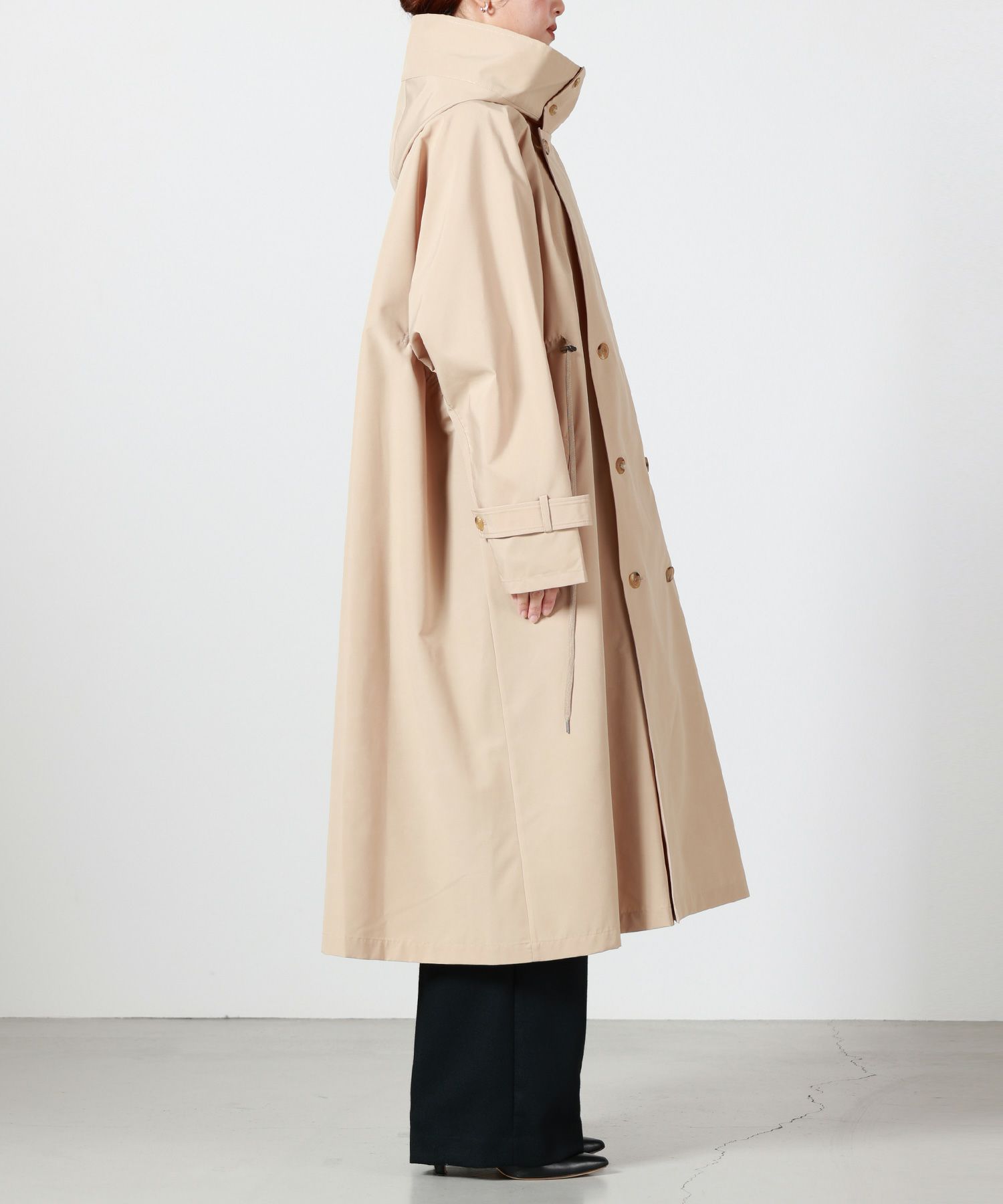 【デザイン】 VACHEMENT(ヴァシュモン)のロングトレンチコート。縦のラインが際立つ洗練されたロング丈シルエットが魅力。ひざ下まで伸びるレングスが、着こなしに上品さと落ち着きを与え、カジュアルからきれいめまで幅広いスタイルに合わせやすい一着です。フロントはクラシックなトレンチのディテールを取り入れ、前を開けてさらりと羽織れば抜け感のある着こなしに、閉じればきちんと感のある装いにも対応します。高めに設計された衿付きフードは取り外し可能で、シーンや気分に合わせて首元の表情を変えることができます。ウエストのドローストリングや袖口のアジャストベルトでシルエットのアレンジも自在に楽しめ、スタイリングの幅が広がるデザインです。飾り過ぎないミニマルな美しさと、トレンチコートならではの品格が共存した一着です。