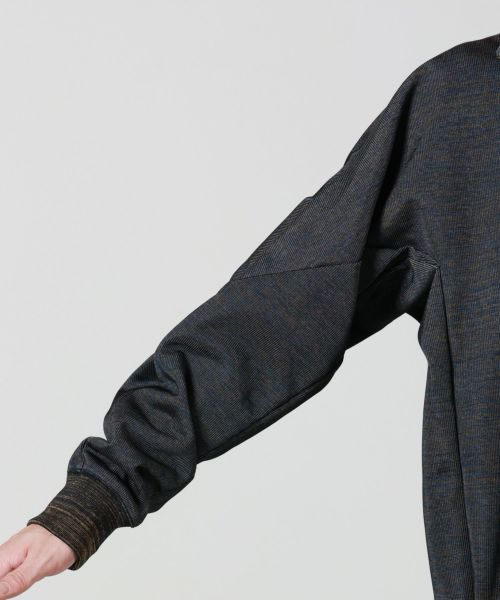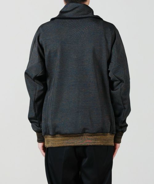 【デザイン】 TOGA VIRILIS(トーガ ビリリース)のプルオーバー。ミックス感が際立つ独自開発のギャラクシージャージー素材を使用。リブ編みの立体感とハーフジップの機能美に加え、襟裏のロゴアクセントがさりげない個性をプラスします。モードな雰囲気とスポーティーさが絶妙に融合したデザインで、洗練されたスタイリングに最適な一着です。