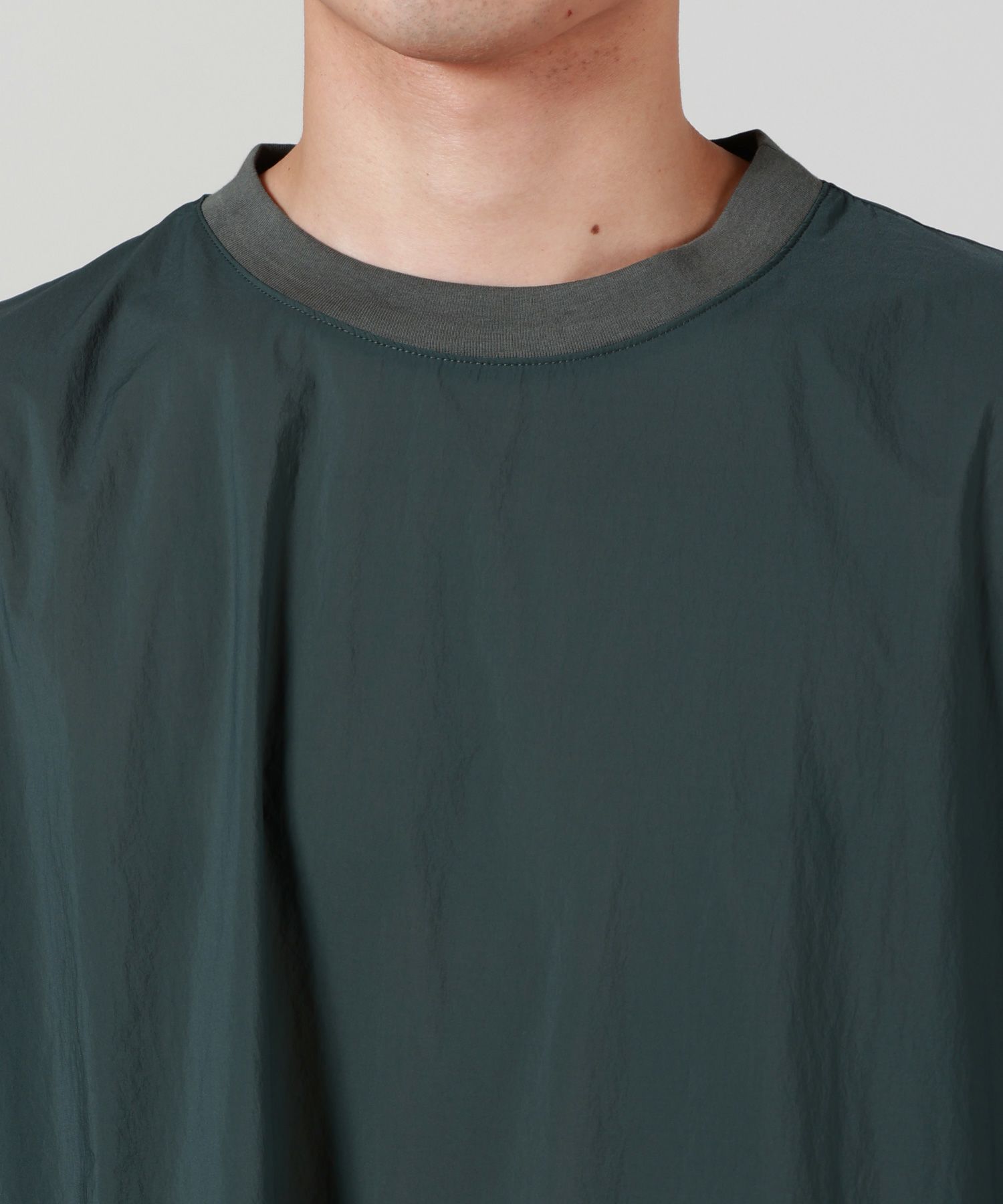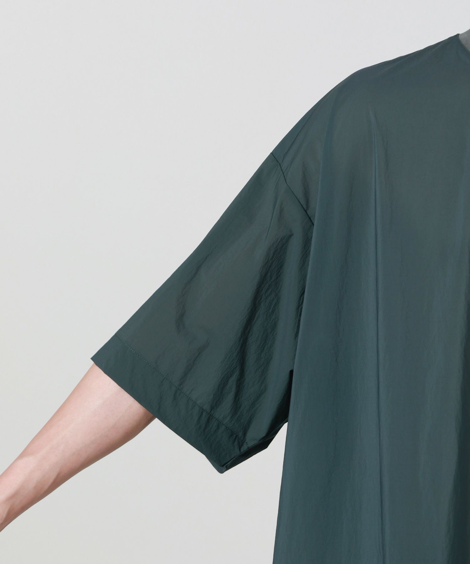【デザイン】 N.HOOLYWOOD(エヌハリウッド)のスピンドル付きTシャツ。 ゆとりのあるボックスシルエットとドロップショルダーが生み出すリラックス感に加え、裾に配されたスピンドルによってシルエットに変化をつけることができる1枚。 接触冷感と2WAYストレッチを備えたナイロン×ポリウレタンのタフタ素材が、夏の肌に心地よくフィットしながら動きやすさも確保します。 左袖とネック背面にはブラックのブランドネームを配置し、洗練された印象をさりげなく主張。 機能面とディテールの工夫によってルーズに見せない、現代的なバランス感覚を備えたTシャツです。