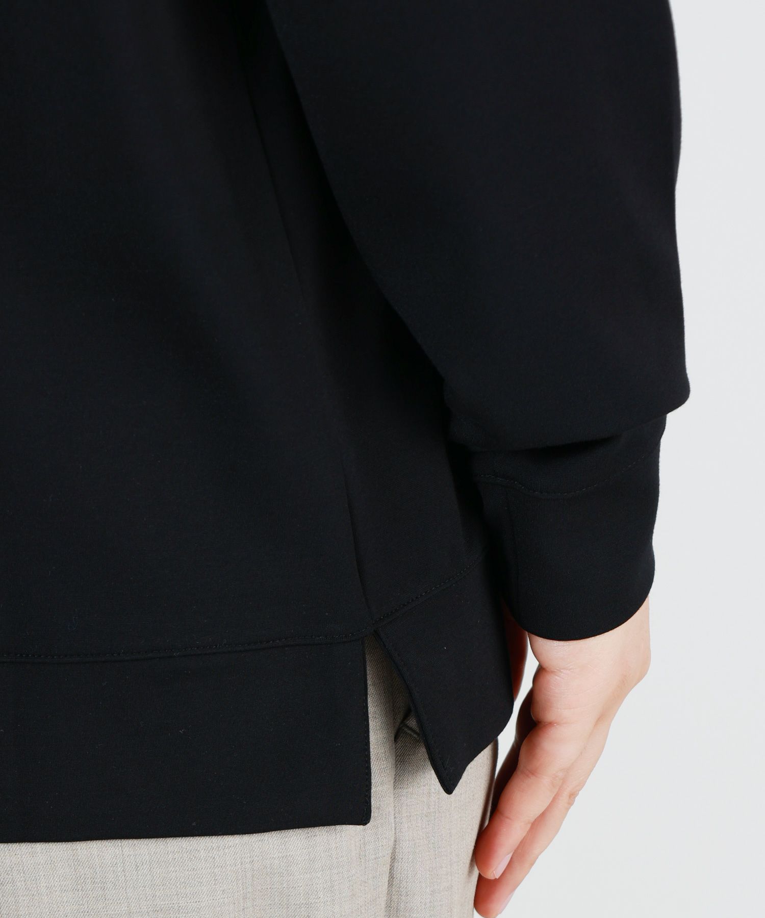 【デザイン】PARIGOT(パリゴ)のトップス。生地にこだわって作製したベーシックなデザインのクルーネックスウェット。裾のテンションや身頃のゆとり感など大人が着てもストレスがかからないような絶妙なパターンにしている。裾のスリットがデザインポイント。