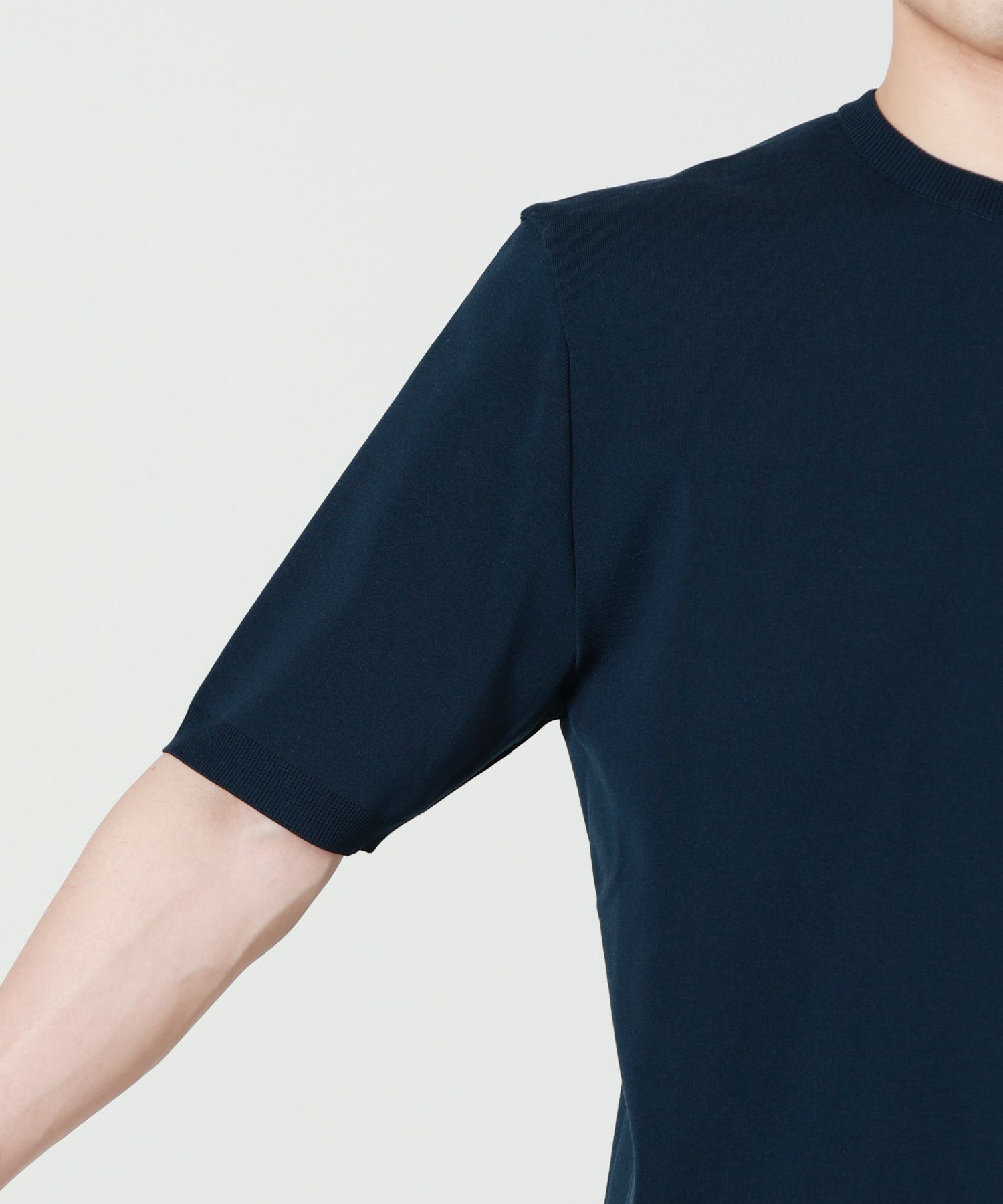 【デザイン】 Revenir(リブニール)の半袖ニット。スタンダードなクルーネックのTシャツは細すぎず緩すぎない絶妙なシルエット。一枚できてもバランス良く着用できることはもちろん、インナーとしてもかさばらず重宝します。
