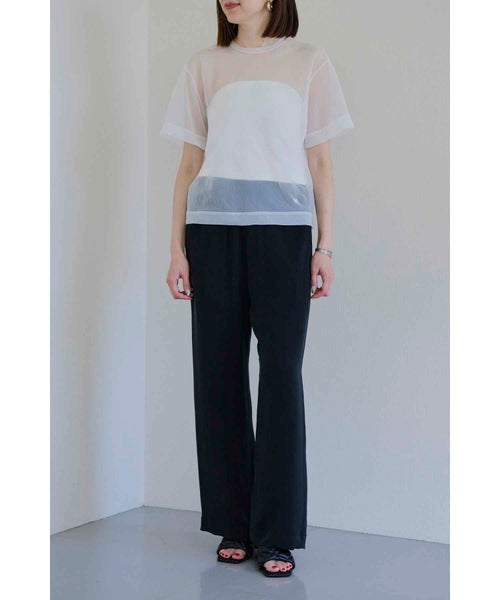 【素材】北陸産の「シアーシフォン ハイゲージジャージ」を使用。 超ハイゲージ編み機で編まれた天竺に特殊加工を施し、ふくらみと立体感をプラスした上品なジャージ素材です。 柔らかく繊細ながら、垂れやダレが出にくいシャキッとした腰が特徴。 強いシアー感を持ちながらマットな質感で上品な透け感を実現し、世代やジャンルを問わず幅広く着用いただけます。