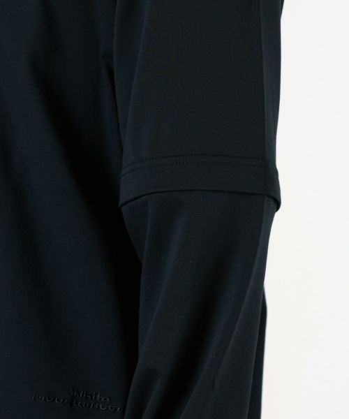 【デザイン】 White Mountaineering(ホワイトマウンテニアリング)のカットソー。PARIGOT別注でブラックのカラーを作成いたしました。肘上のジッパーで半袖Tシャツになる2WAYの仕様になったロングスリーブのアイテムです。後染め染色でキックバック性に優れたリバー組織。別色でレイヤードした裾がアクセントになっています。程よくゆとりのあるボックスシルエットで、幅広いシルエットのパンツと合わせていただけます。左裾付近に施されたブランドロゴの刺繍もワンポイントのアクセントになっています。