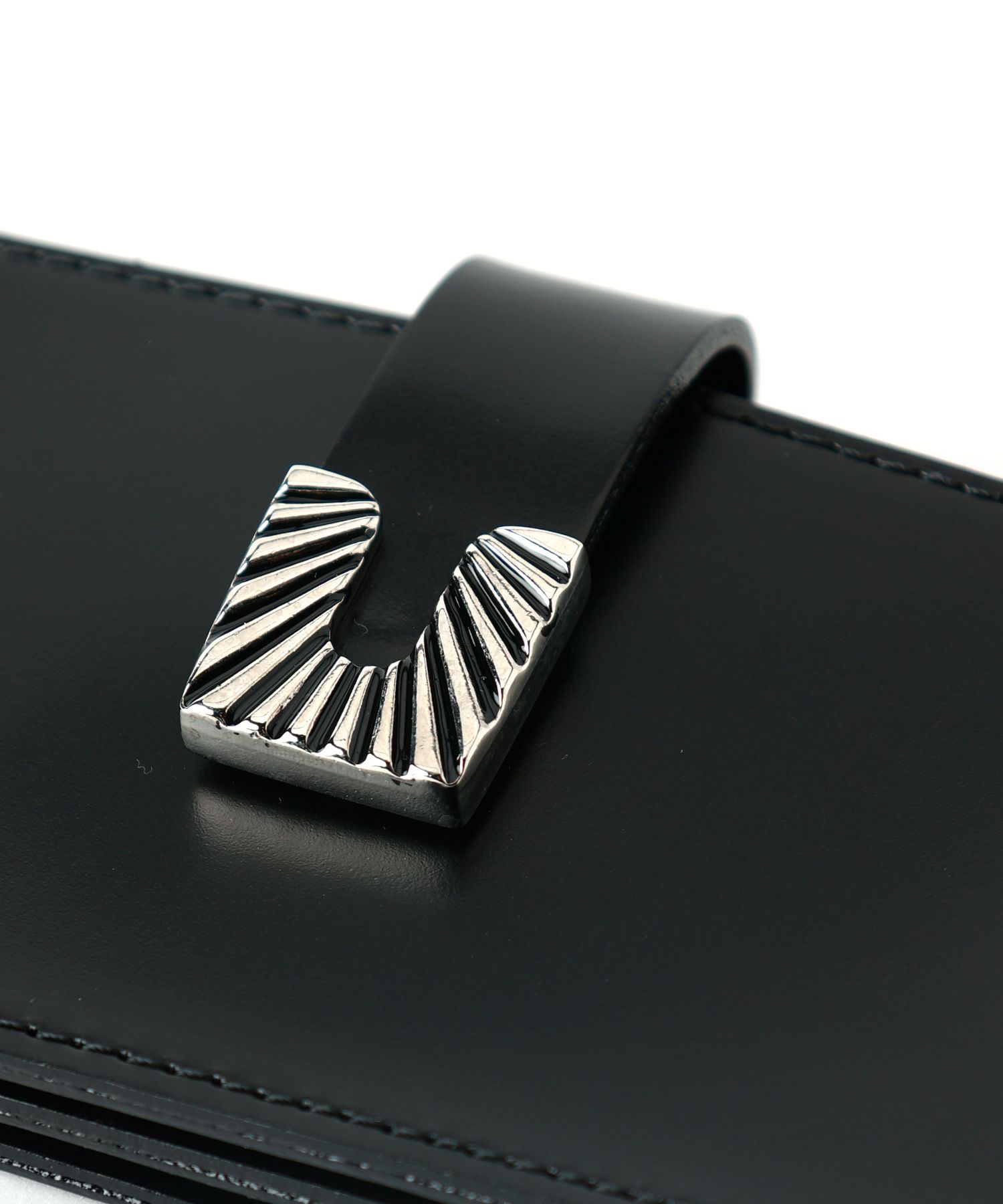 【デザイン】 TOGA TOO(トーガ トゥー)のレザーウォレット。メタルパーツと艶感のあるレザーが特徴的。内側にカードスロット2つ、ジップ式のコインポケットがついています。スナップボタン開閉。