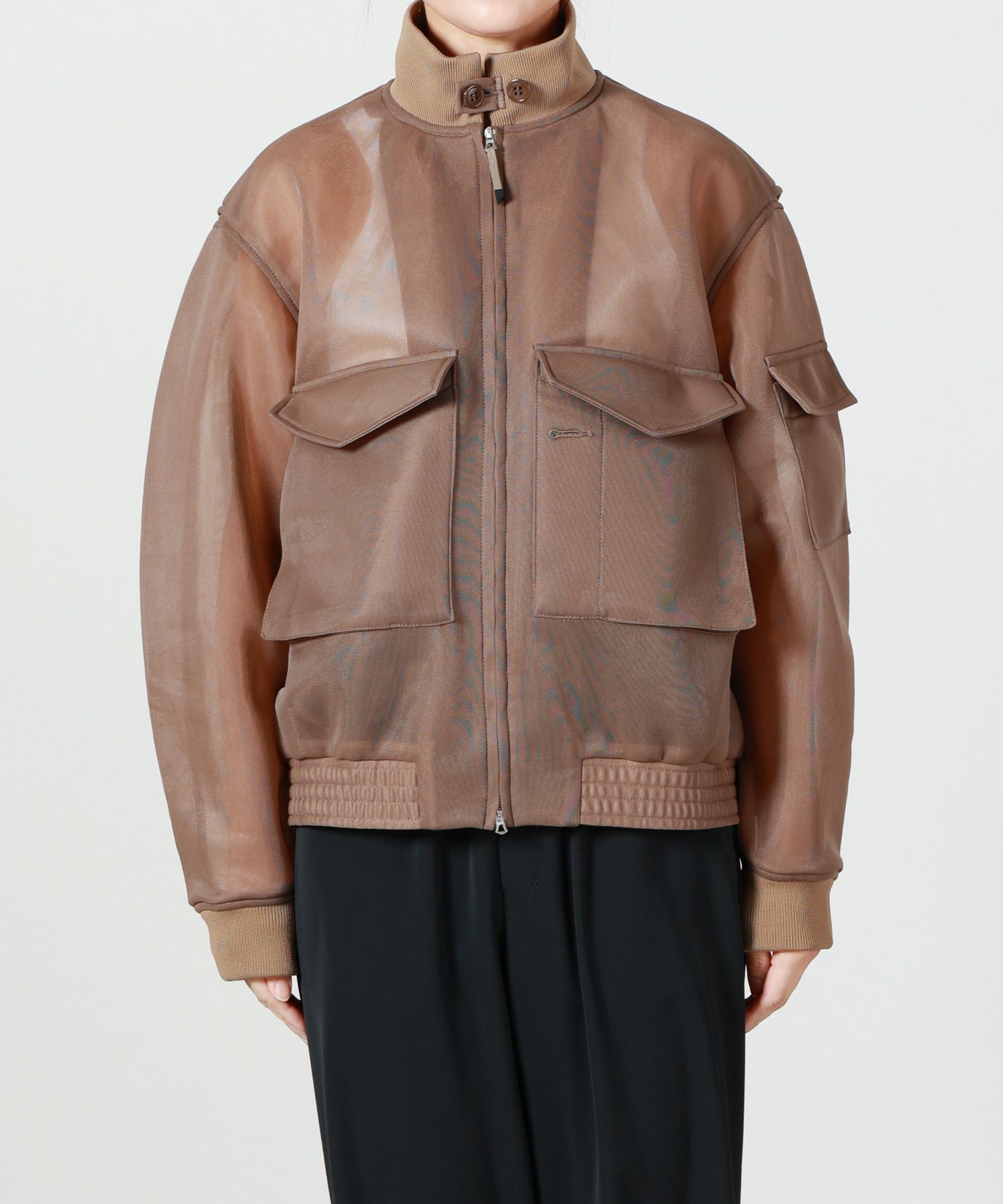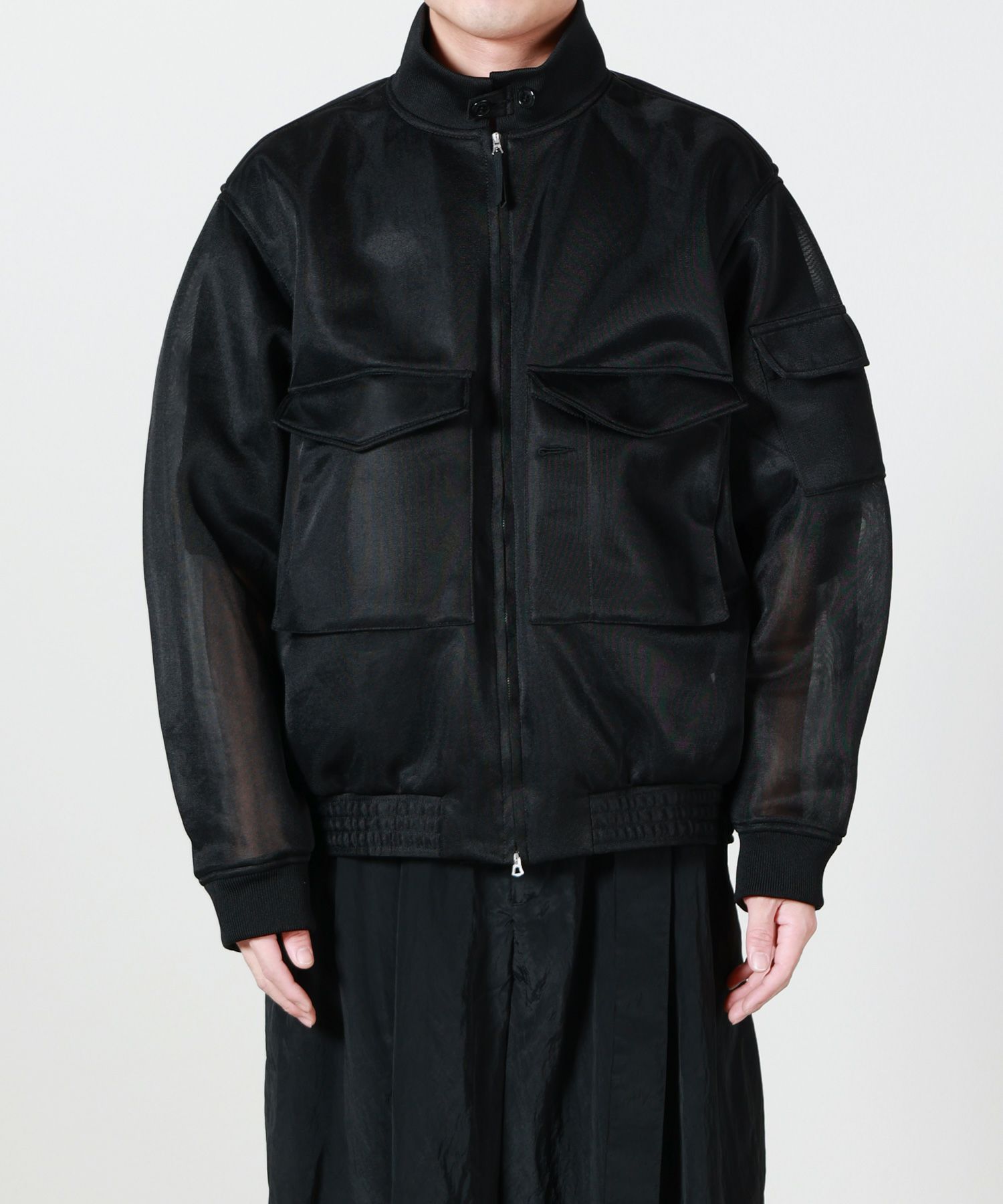 【デザイン】HYKE(ハイク)のジャケット。HYKE定番のWEPジャケットをベースに、全体をシアー素材で表現したモダンなデザインです。ミリタリー由来のディテールを残しながら、透け感のある素材使いによって軽やかで洗練された印象に仕上げています。程よくゆとりのあるシルエットが立体感を生み、羽織るだけでスタイリングに奥行きをプラス。ハードになりすぎず、シーズンムードを高めるユニセックスなアイテムです。