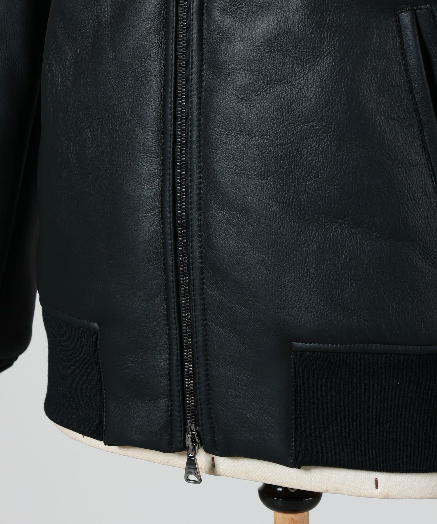 【素材】 表地には、某ラグジュアリーブランドでも使用された最高品質のムートンを採用。毛足の整った密度の高いシープスキンは、手にした瞬間に“本物”と感じられるしっとりとした滑らかさと、もっちりとした厚みのある質感を備えています。軽く、温かく、そして美しい艶を持つこのムートンは、着込むほどに風合いが増し、長く愛用できる素材です。襟・袖・裾のリブ部分にはウールをベースにアクリル・ナイロン・ポリウレタンを配合し、柔らかさと耐久性、そしてフィット感を高めています。