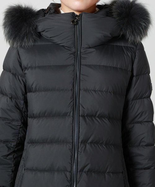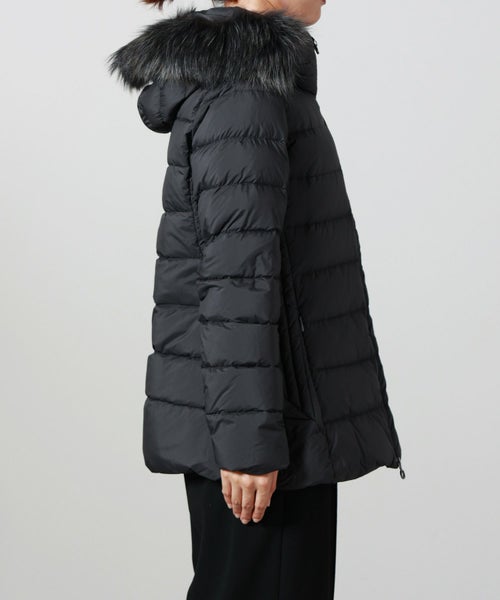 【素材】表地はナイロン100%で、マットな質感が落ち着いた印象を与えます。中綿はダウン90%・フェザー10%で軽やかさと保温性を両立。裏地もナイロン100%で滑らかに着用でき、ポーランドラクーン(タヌキ)ファーが柔らかく、上品な光沢を添えています。触れるとふわりとした手触りで、着たときには暖かく包み込まれるような着心地が特徴です。