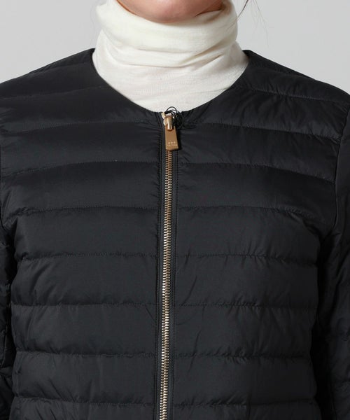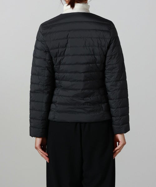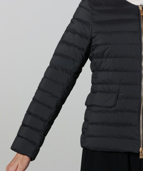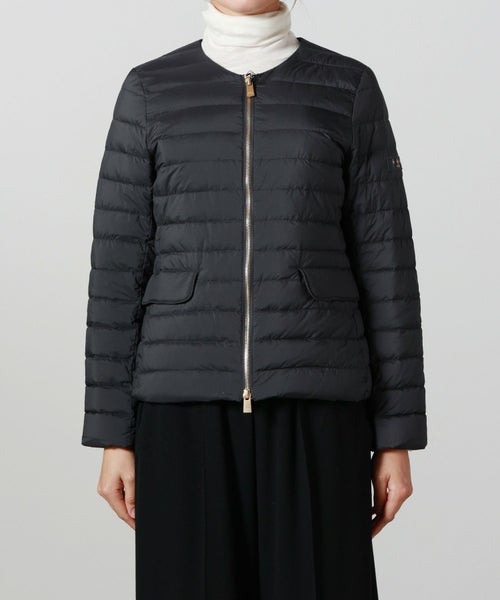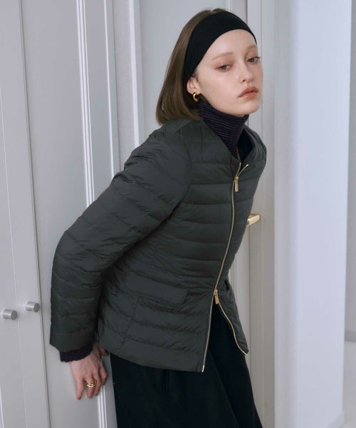 【デザイン】TATRAS(タトラス)のダウン。コンパクトなノーカラーデザインが特徴で、ウエストや袖のラインにこだわり、美しいシルエットを実現。デコルテをさりげなく見せるネックラインや、フロントのゴールドファスナー、腰のスナップボタンが華やかさとアクセントをプラス。ポケット内側には起毛素材をあしらい、手元を暖かく保つ仕様です。カジュアルながら上品な印象で、幅広いコーディネートに馴染む洗練された一着です。