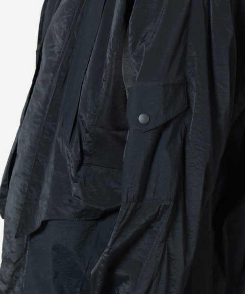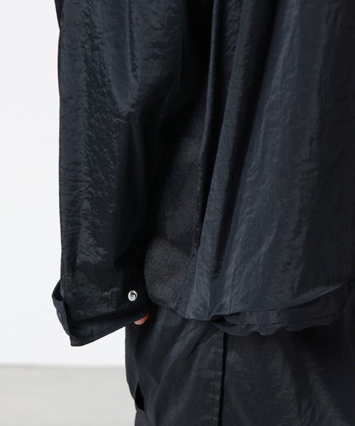 【素材】 表地にはポリエステルをベースにポリウレタンをブレンドした透け感のある軽やかな素材を使用。軽やかさの中にほどよいハリ感を持たせながら、通気性に優れた快適な着心地を実現。別布にはナイロン×ポリウレタン素材を採用し、さらりとしたタッチと軽快さをプラス。異素材ならではの質感のコントラストが、見た目にも奥行きを与えます。さらに別布部分にはポリエステル100%素材を使用することで、軽さと扱いやすさを両立。裏地もポリエステル素材のため、袖通しがよくスムーズな着脱が可能です。繊細でなめらかな肌触りが心地よく、さらりと羽織れる軽快さが魅力のデイリーに活躍する快適な素材構成に仕上がっています。
