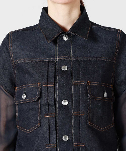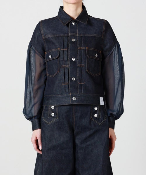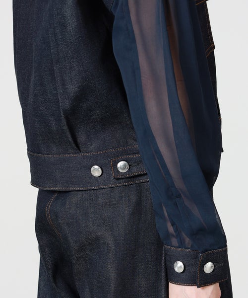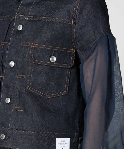 【デザイン】 HYKE(ハイク)のジャケット。SS26コレクションでも存在感を放った一着。ヴィンテージデニムのような表情が特徴的なデニムジャケットです。無骨なデニム本体とシアー素材が融合し、デザイン性を高めています。