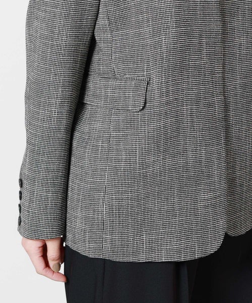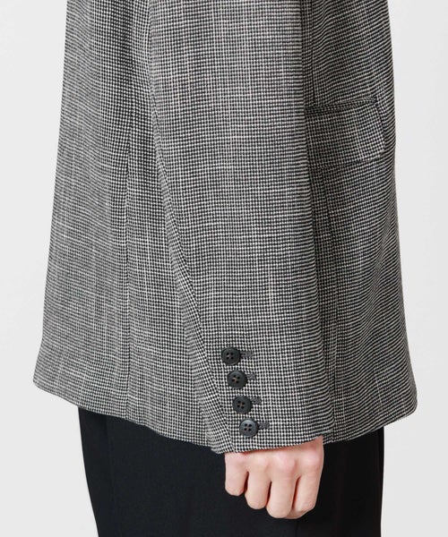 【素材】 ポリエステルとレーヨンの混紡素材を使用し、ハリ感と落ち感をバランスよく兼備。さらりとした凹凸のある生地が、見た目にも着心地にも清涼感をもたらします。裏地はポリエステル100%で、裏地は肩と袖部分のみに施し、快適な着用感と軽さを両立しました。程よいシアー感が軽やかさを引き立て、シーズンムードを高めます。