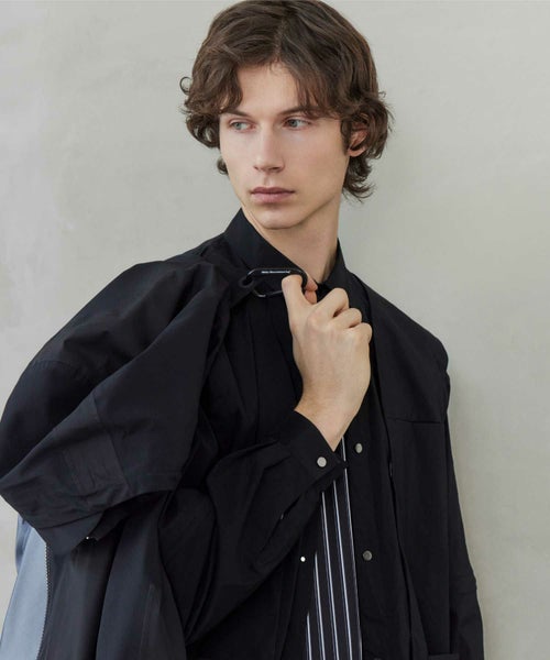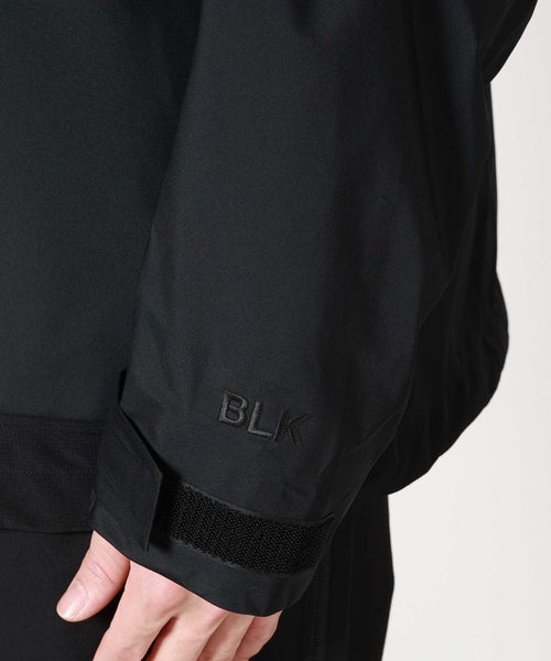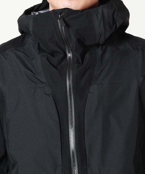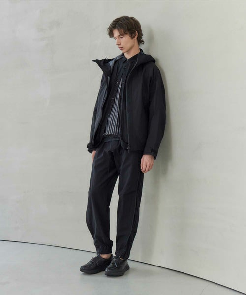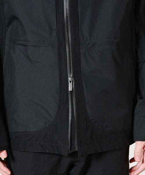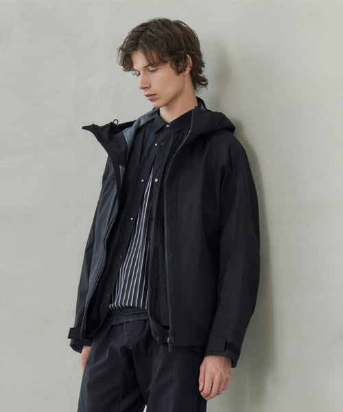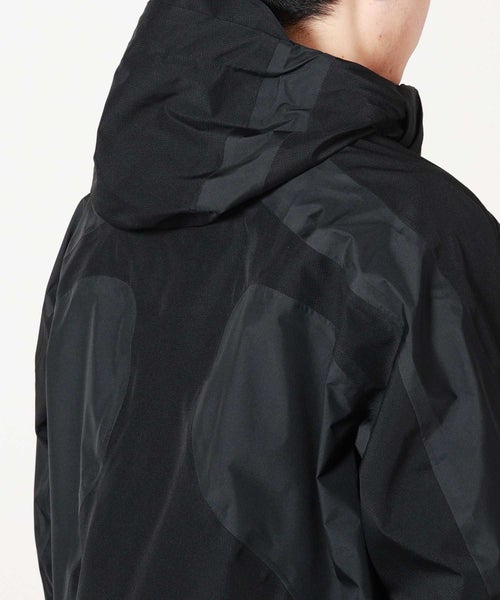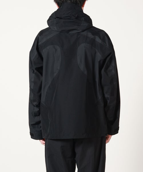 【デザイン】White Mountaineering(ホワイトマウンテニアリング)のジャケット。防水性、防風性、透湿性を備えるGORE-TEXを搭載したマウンテンパーカです。表地は20デニールの柔らかく軽量な極小リップストップと、耐久力のある70デニールナイロンリップストップを組み合わせて構成されています。これにより、同じ黒でも配色のようになり、デザイン性を高めています。ダブルファスナーやポケットの止水テープ、袖口のベルクロなど、デザインだけでなく実用面も意識された一着です。 シルエットはシンプルながらも、BLKらしい複雑な曲線切替を多用したデザインに仕上がっております。