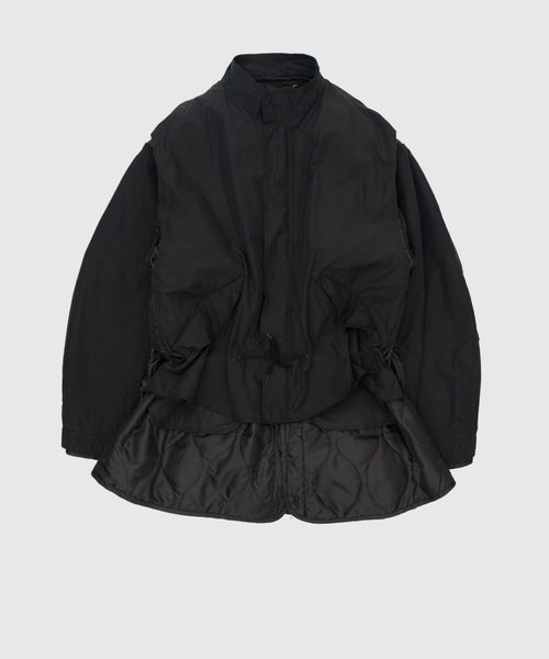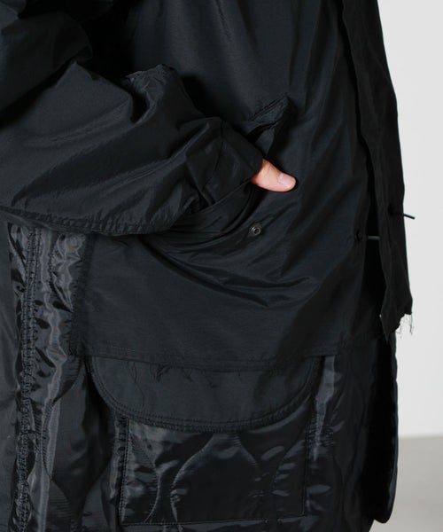 【デザイン】 YOKE(ヨーク)のブルゾン。M-65 FISHTAIL PARKAとキルティングライナーが再構築されたミリタリーブルゾン。コート丈をブルゾン丈にカットし、下からキルティングライナーがのぞく仕様にしてあります。袖も解体し、ライナーと縫い合わせることであえて余りを生み、違和感を待たせました。マン・レイのシュールレアリスムのオブジェのインスピレーションから異なるアイテムの組み合せを構築したデザインに落とし込みました。ヨークらしい解釈で、他にないようなデザイン・パターンのM-65に仕上がっています。