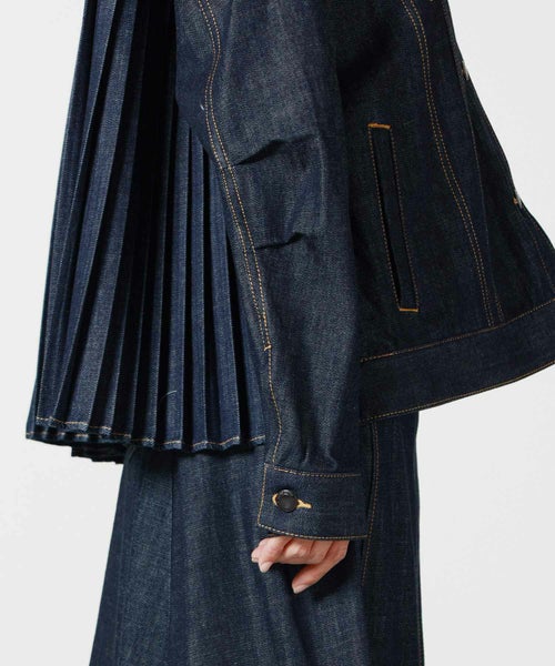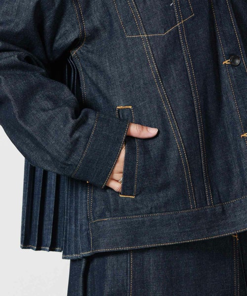 【デザイン】エズミのアイコンになっているプリーツデザインを踏襲したデニムジャケット。定番3rdタイプのモデルをベースに ステッチを効かせたディテールにスタンドカラーの襟、襟の端には挟み込んだ生地をフリンジのようにして洗練された雰囲気を出しています。 シルエットはドロップショルダー、バックにはデニムのプリーツをあしらう大胆なデザインに。 デニムにプリーツをかけられるのは日本でもひとつの工場でしかできない、職人の技術を現代的なデザインに昇華しています。 デイリーにも、ワンピースに羽織ることもでき、オールマイティーにスタイリングできるデニムジャケットです。