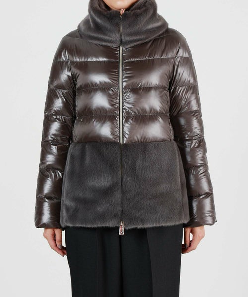 【デザイン】HERNO(ヘルノ)のダウンジャケット。軽量ナイロンとエコファーの異素材コンビネーションブルゾ ンです。HERNOの定番ともいえる、20デニールの生地を使用し、インジェクション(ダウン直接注入)で仕上げた軽量ダウン。襟にファブリックと同系色のエコファーあしらった遊び心のあるデザイン。軽やかな着心地とコストパ フォーマンスに優れたモデルです。すっきりとした胸元と、裾が長く立体的な美しいラインが特徴です。