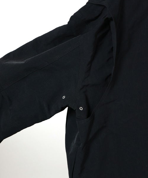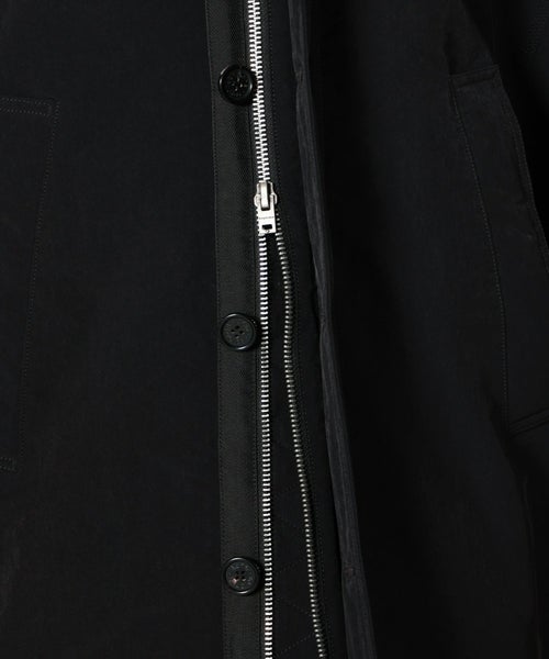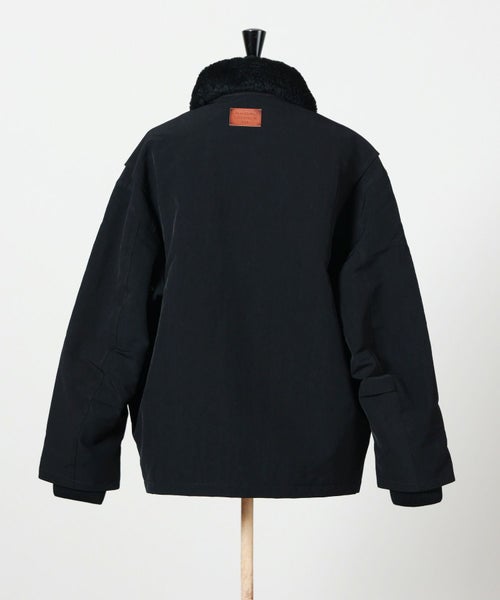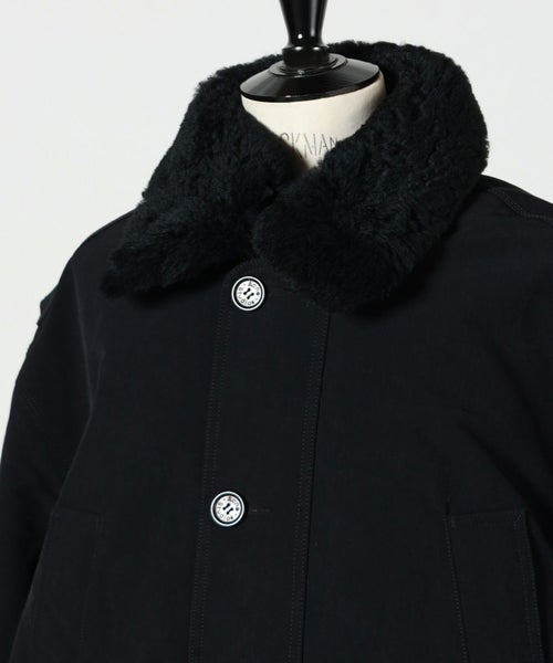 【素材】表地には厚手起毛のヴィンテージ風ナイロン素材を採用し、耐久性とモダンな雰囲気を兼ね備えています。襟部分には高級ラムシアリングを使用。滑らかな起毛感がラグジュアリーなアクセントとなっています。裏地と中綿にはともにポリエステル素材を用い、軽量ながら保温性を確保。総裏仕様で仕立てが丁寧な一着です。