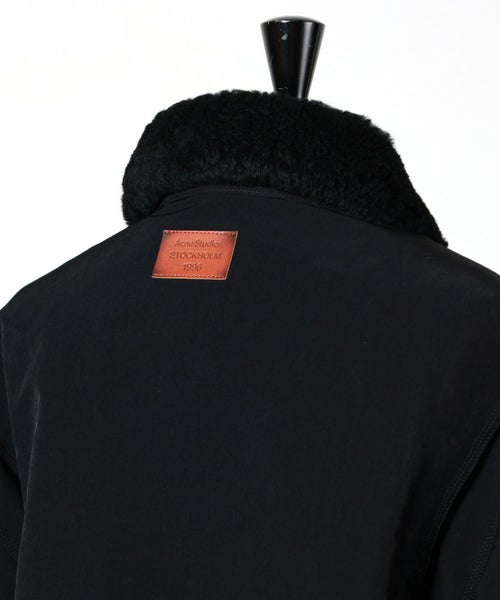 【デザイン】Acne Studios(アクネストゥディオズ)のジャケット。ヴィンテージ風の起毛仕上げの厚手のナイロンで作られており、シアリングの襟が特徴。フロントにジッパーとボタン留め、ウエストにウェルトポケット、サイドシームポケット、リブ編みの袖口、バックネックラインにレザーロゴパッチ。リラックスした袖、ヒップ丈のリラックスフィット。