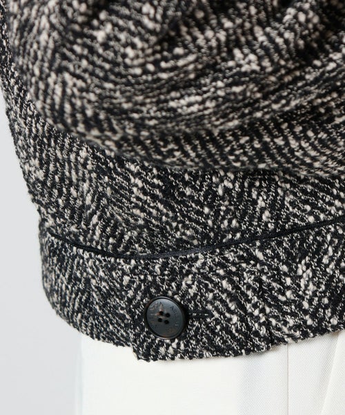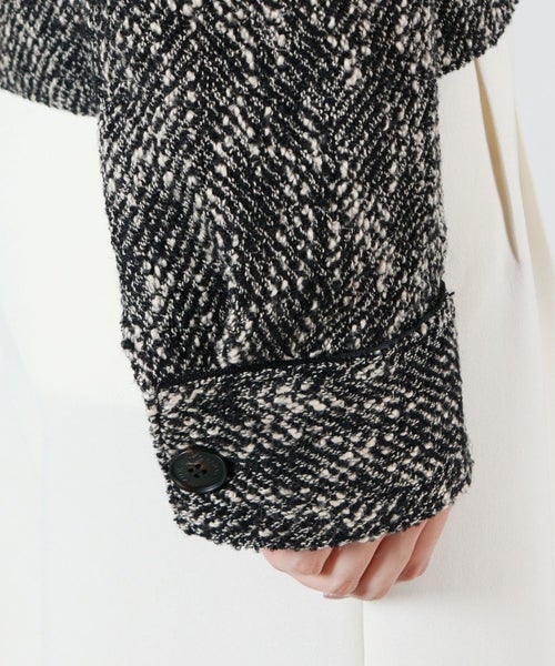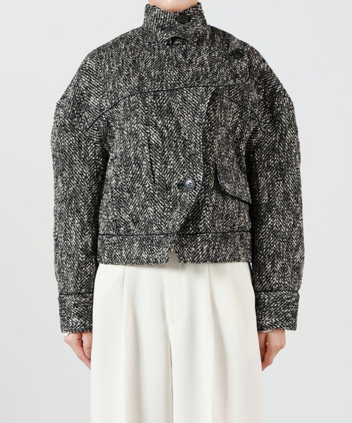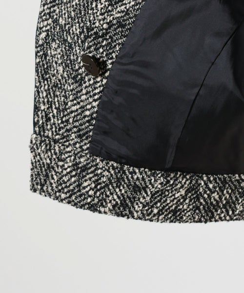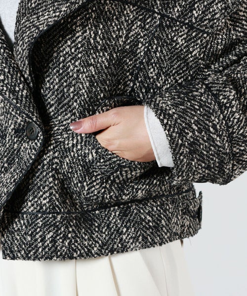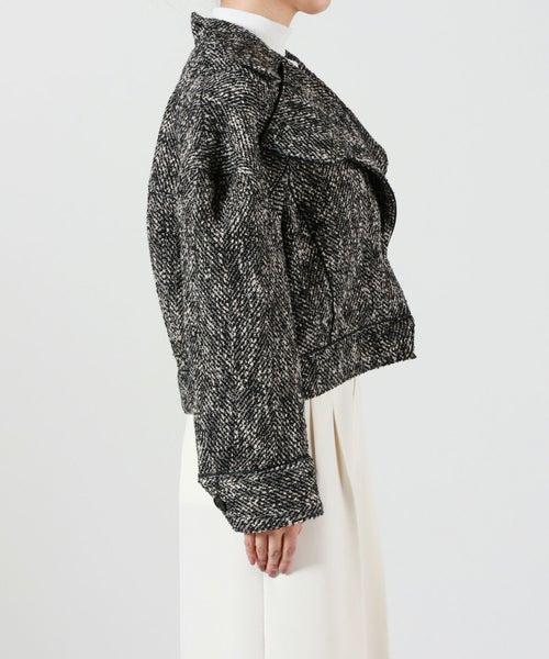 【デザイン】AKIRANAKA(アキラナカ)のジャケット。構築的なシルエットと繊細なディテールが融合した、現代的でエレガントな一着。ショート丈に仕上げることで、全体のバランスを引き締め、トレンド感とスタイルアップ効果を両立。前を開けて軽やかに羽織るのはもちろん、ボタンを閉じてミニマルな着こなしに仕上げても美しく決まります。